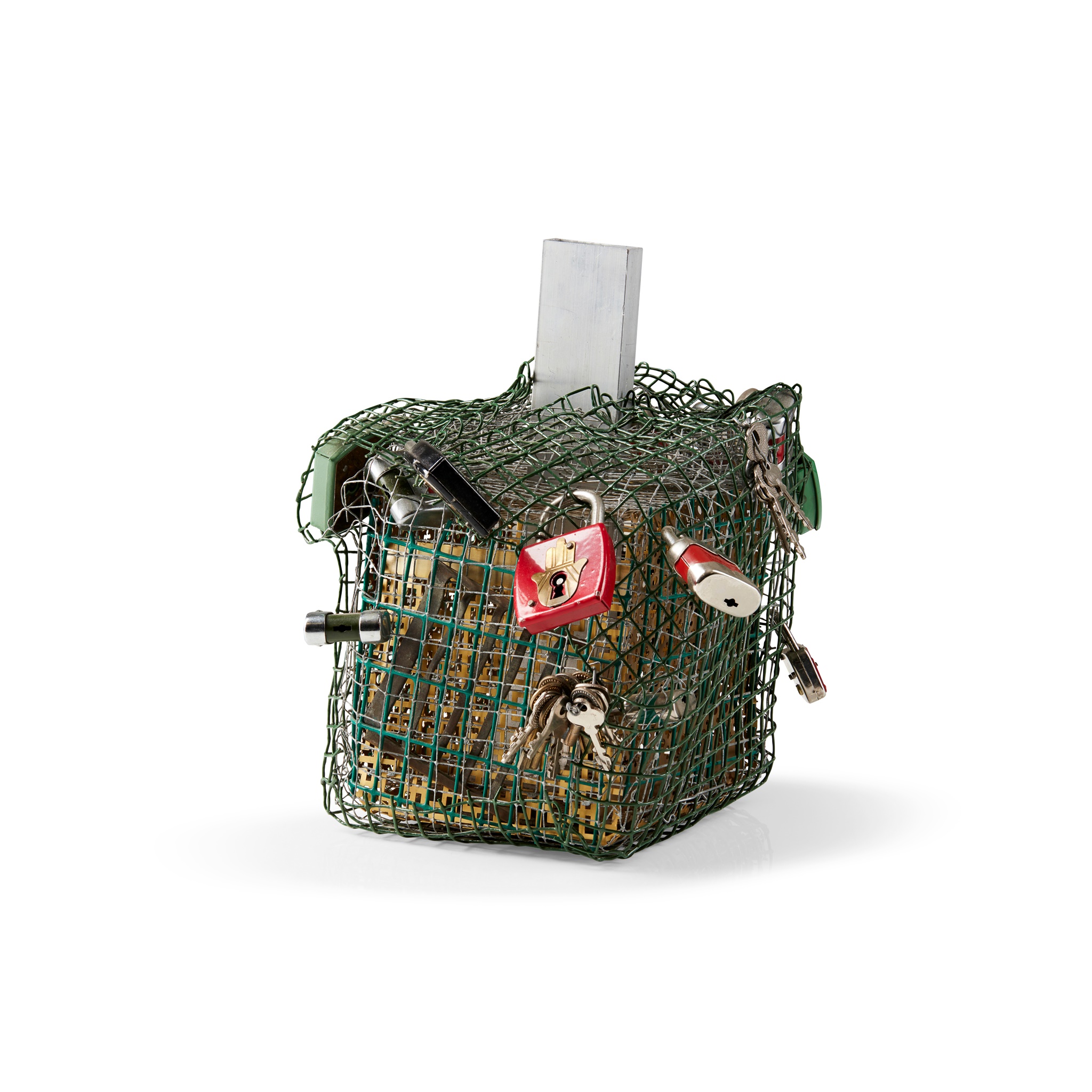 Unique but following a generic design, ed. 2000, wire, steel, plexiglass, extruded aluminium tube, with 12 padlocks and 2 bunches of keys, from Toys by Artists, copyright and patent Bonnier International Design, 1972