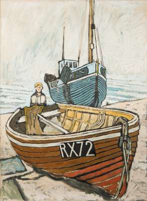 The current work was probably painted around 1965 when Bratby was in Dungeness, on the Kent Coast. It depicts the artist's son David standing behind the fishing boat 'RX72'