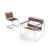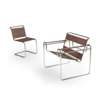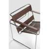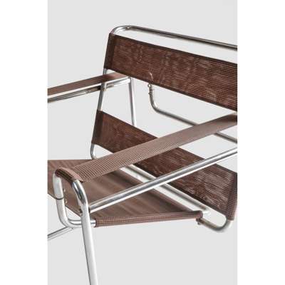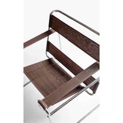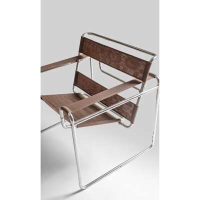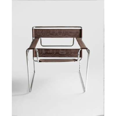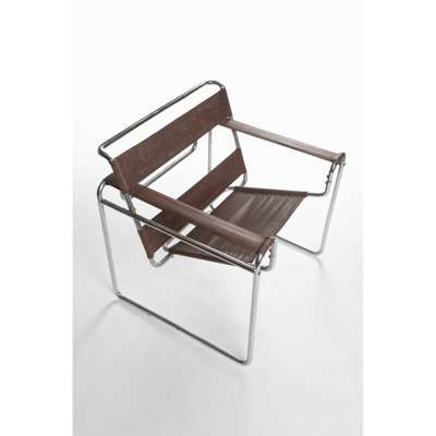 Marcel Breuer first developed the design for the ‘B3’ or ‘Wassily’ Chair in 1925, taking ‘the pipe dimensions…from my bicycle. I didn’t know where else to get it or how to figure it out’. Over a period Breuer developed the chair from the original version which connected the side legs in a sled or runner arrangement, to the later version where the uprights are connected in an uninterrupted design. By the 1930s Thonet modified Breuer's design without his permission, as they held copyright, by altering the frame at the front edge of the seat and adding a floor stretcher to stabilise the form.