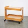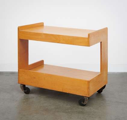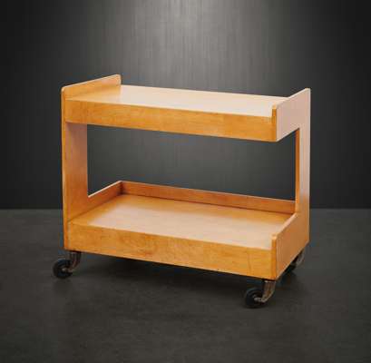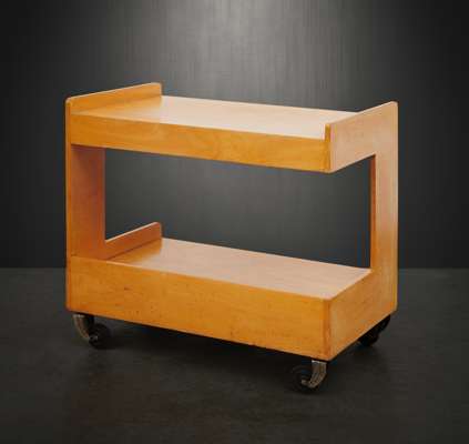 An example of this design is held in the V & A Collection, London (RF78 / 1124). For increased functionality the design features only two uprights. The design drawing from 1935 specified that it should have 'Flexello' castors and that the tiers should have rubber liners which could be removed for cleaning. The design was available in natural polish, as well as black or white.