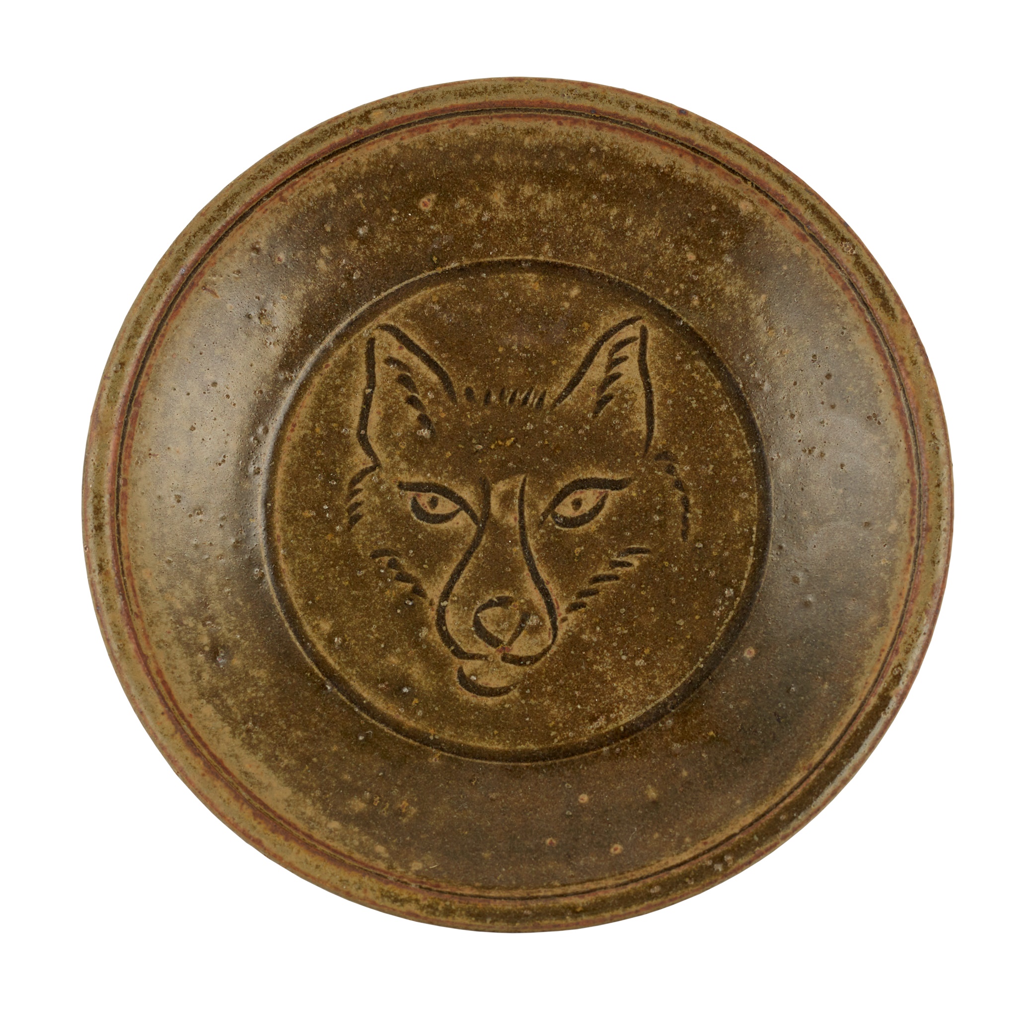 simpressed artist’s seal, stoneware, ash glaze, with sgraffito decoration of a fox