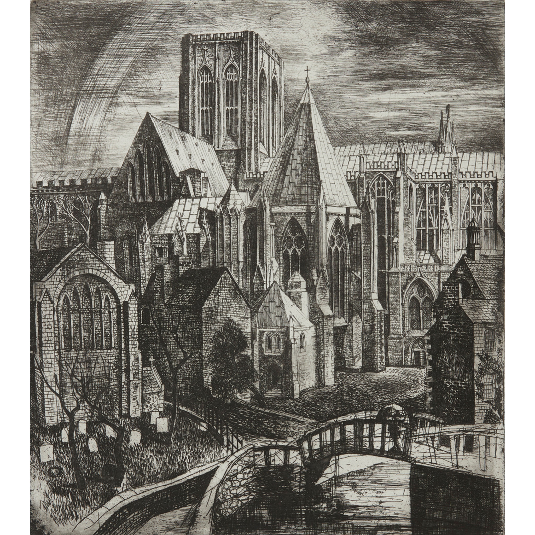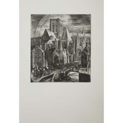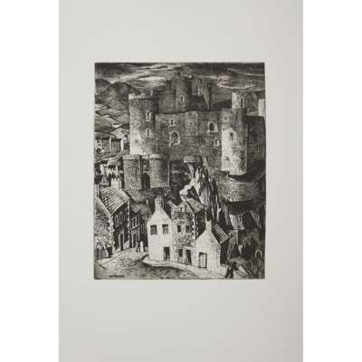 Arguably the most compelling work produced over William Wilson’s varied career was his etchings. In his youth Wilson cultivated his eye for composition while apprenticed to the stained glass firm James Ballantyne & Son. He later attended evening classes at Edinburgh College of Art, where he was introduced to printmaking by Adam Bruce Thomson. A 1932 Carnegie Travelling Scholarship from the Royal Scottish Academy enabled him to travel to France, Spain, Italy and Germany, where he developed many of the compositions in the present edition.