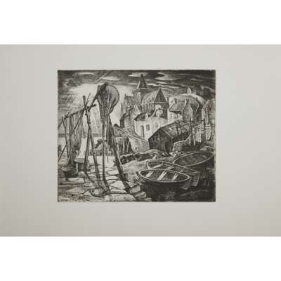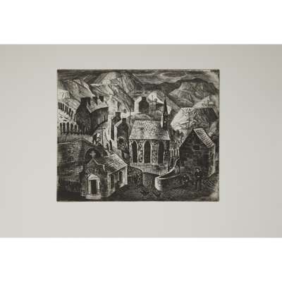 Arguably the most compelling work produced over William Wilson’s varied career was his etchings. In his youth Wilson cultivated his eye for composition while apprenticed to the stained glass firm James Ballantyne & Son. He later attended evening classes at Edinburgh College of Art, where he was introduced to printmaking by Adam Bruce Thomson. A 1932 Carnegie Travelling Scholarship from the Royal Scottish Academy enabled him to travel to France, Spain, Italy and Germany, where he developed many of the compositions in the present edition.