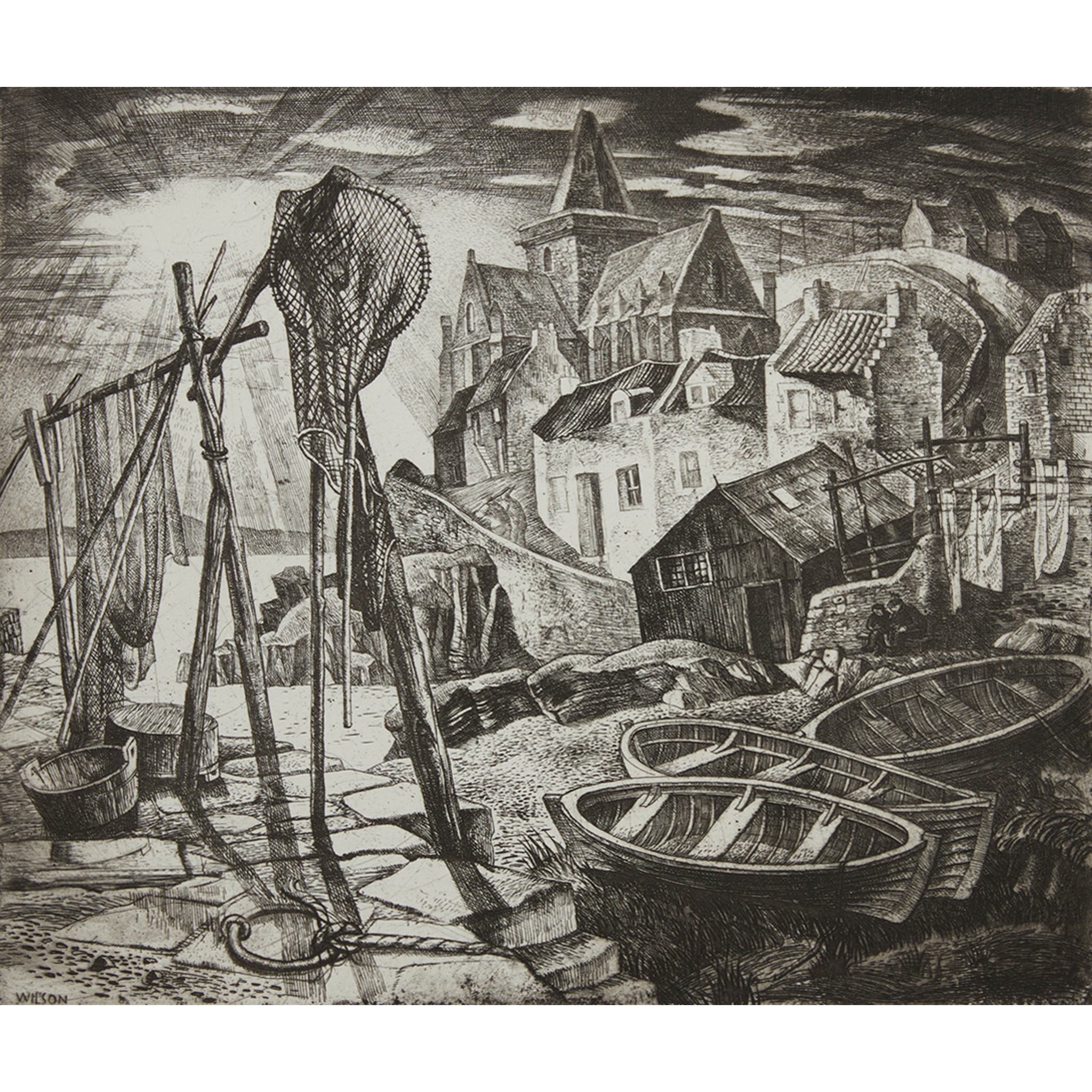 Wilson commenced full-time study at Edinburgh College of Art, and befriended the artist Ian Fleming who helped him further cultivate his etching and engraving skills. He continued his studies at the Royal College of Art in London, and met the artist Edgar Holloway, with whom he set up a printing press. The pair travelled widely, and Wilson produced further etchings inspired by European topography and architecture.