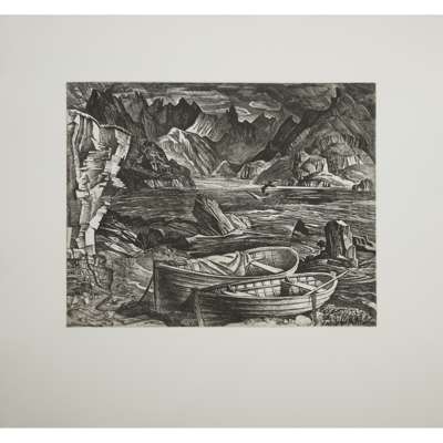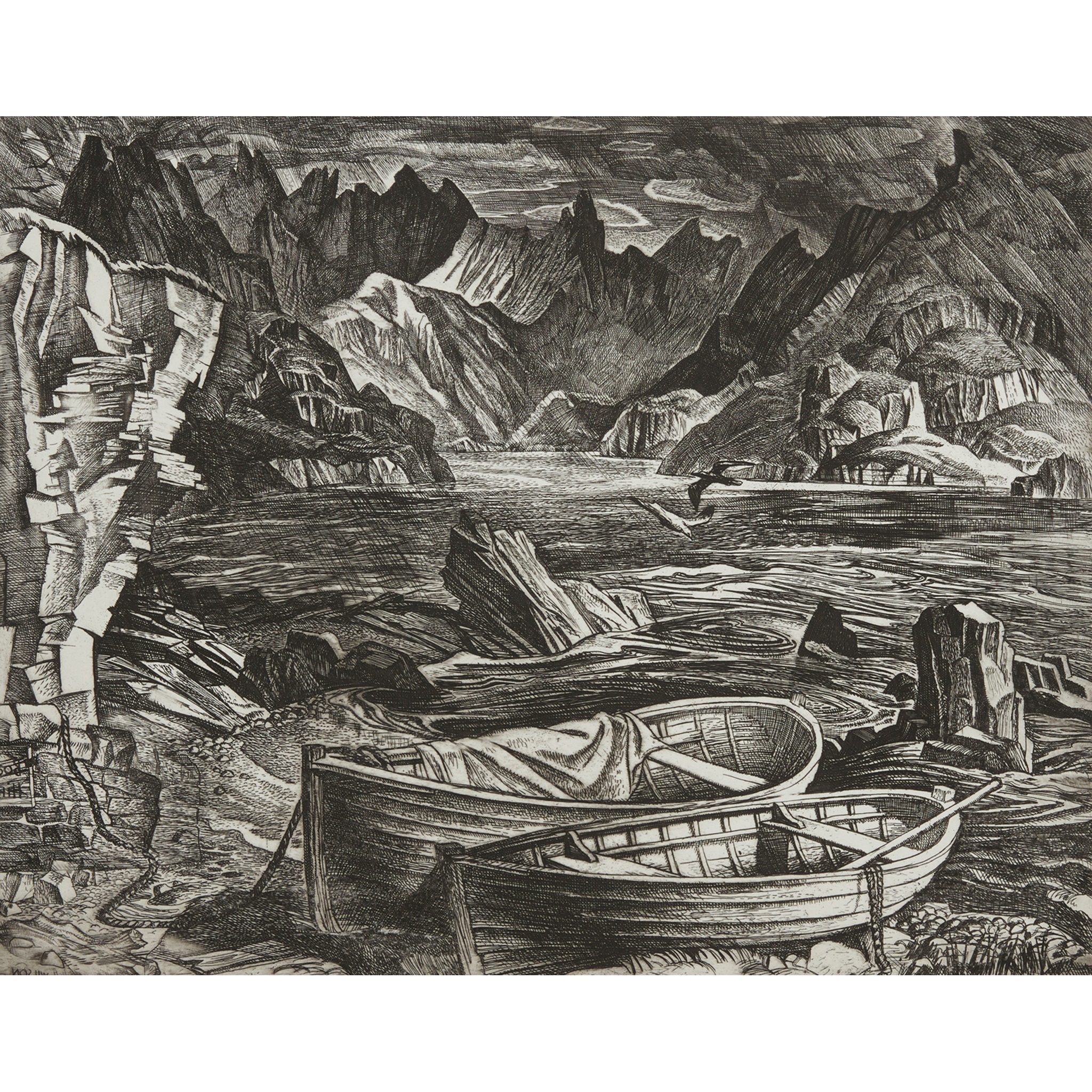Arguably the most compelling work produced over William Wilson’s varied career was his etchings. In his youth Wilson cultivated his eye for composition while apprenticed to the stained glass firm James Ballantyne & Son. He later attended evening classes at Edinburgh College of Art, where he was introduced to printmaking by Adam Bruce Thomson. A 1932 Carnegie Travelling Scholarship from the Royal Scottish Academy enabled him to travel to France, Spain, Italy and Germany, where he developed many of the compositions in the present edition.
