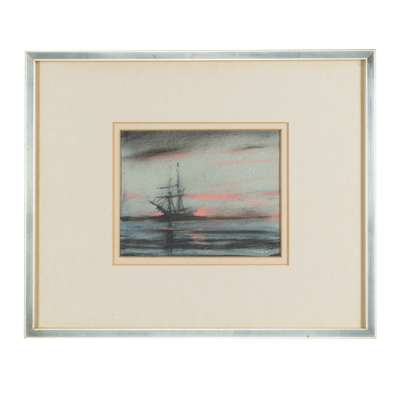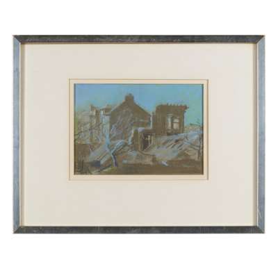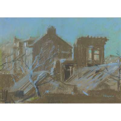 'Rooftops at Dusk', signed lower right, pastel on grey paper