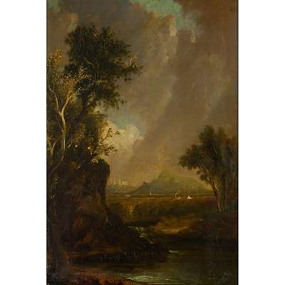 A WOODED RIVER LANDSCAPE WITH DISTANT VIEW OF EDINBURGH AND ARTHUR'S SEAT