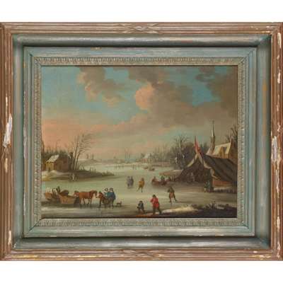 A WINTER LANDSCAPE WITH FIGURES AND SKATERS ON A FROZEN LAKE