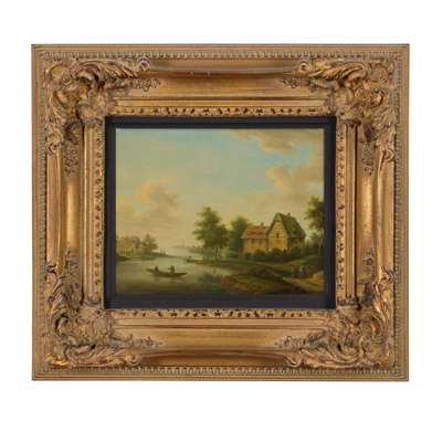 A WOODED RIVER LANDSCAPE WITH TRAVELLERS AND BOATMEN