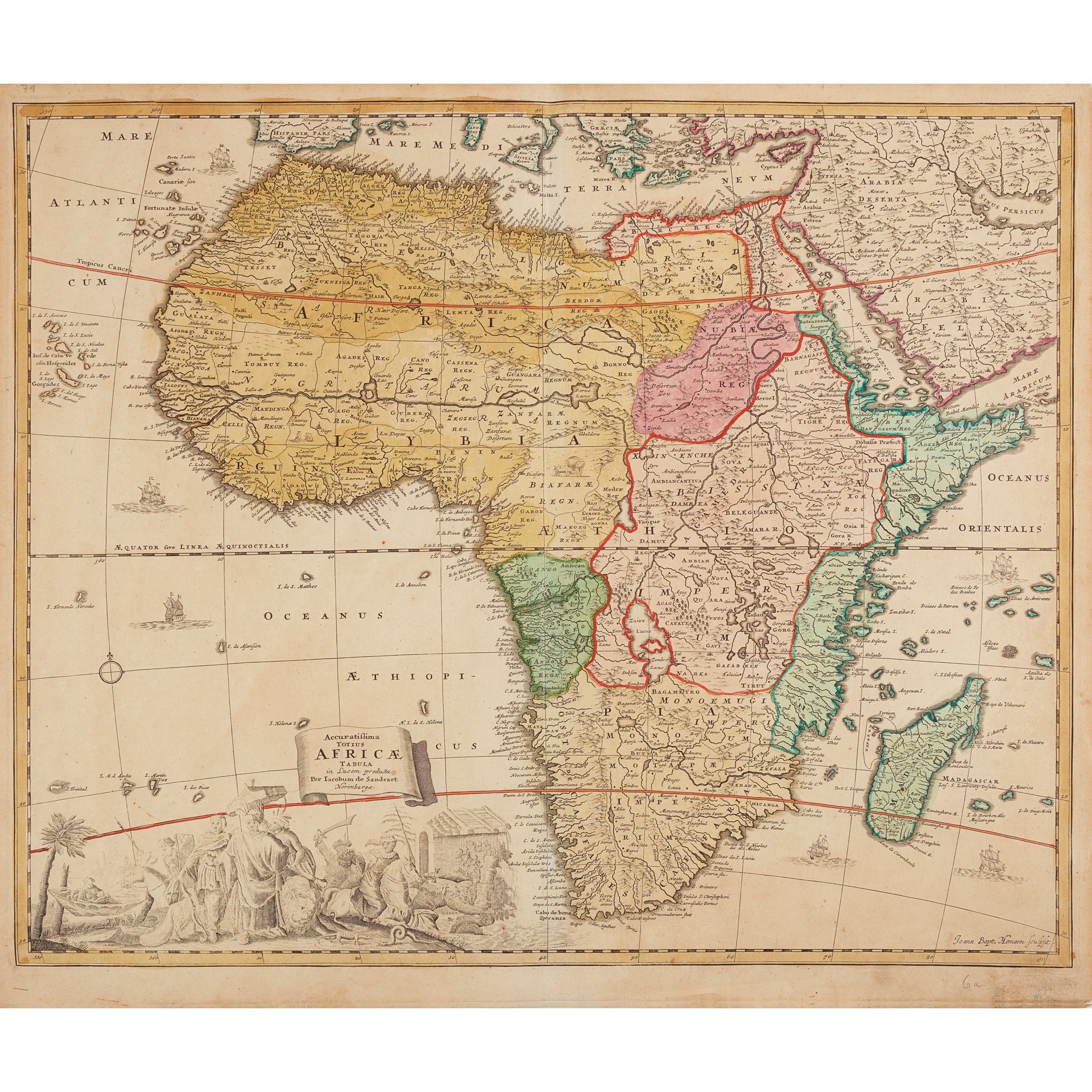 Paris, 1685, 94 x 64.5cm, hand-coloured; [Map of Africa] Sandrart, Jacob von Accuratissima Totius Africae. Tabula, Nuremberg, [1675], engraved map, 60 x 52cm, hand-coloured (2)
