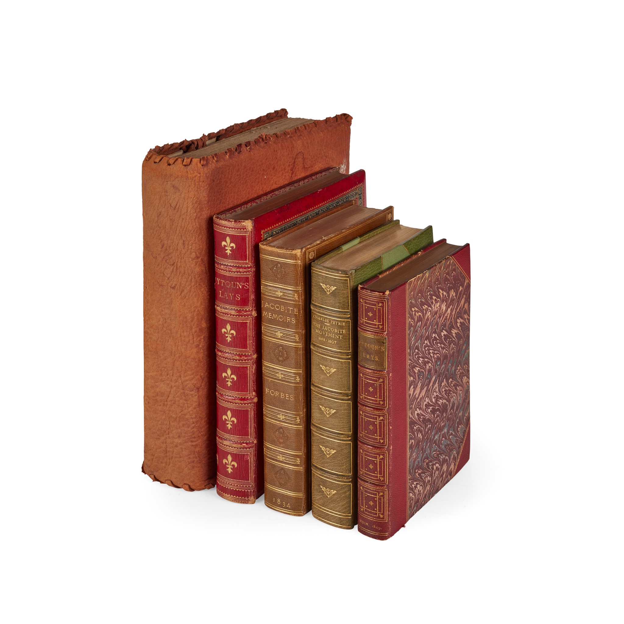 comprising: Petrie, Charles. The Jacobite Movement. 1948, 8vo, green half morocco gilt, t.e.g.; Forbes, Robert Jacobite Memoirs of the Rebellion of 1745. 1834, 8vo, light brown panelled morocco gilt, t.e.g.; Aytoun, W.E. Lays of the Scottish Cavaliers. 1865. 4to, illustrations, red morocco gilt with blue onlays, g.e.; Aytoun, W.E. another copy, 1849, 8vo, red half morocco gilt, t.e.g.; Ridpath, George The Border-History of England and Scotland. 1776. 4to, original boards, uncut, title browned, upper cover detached (5)