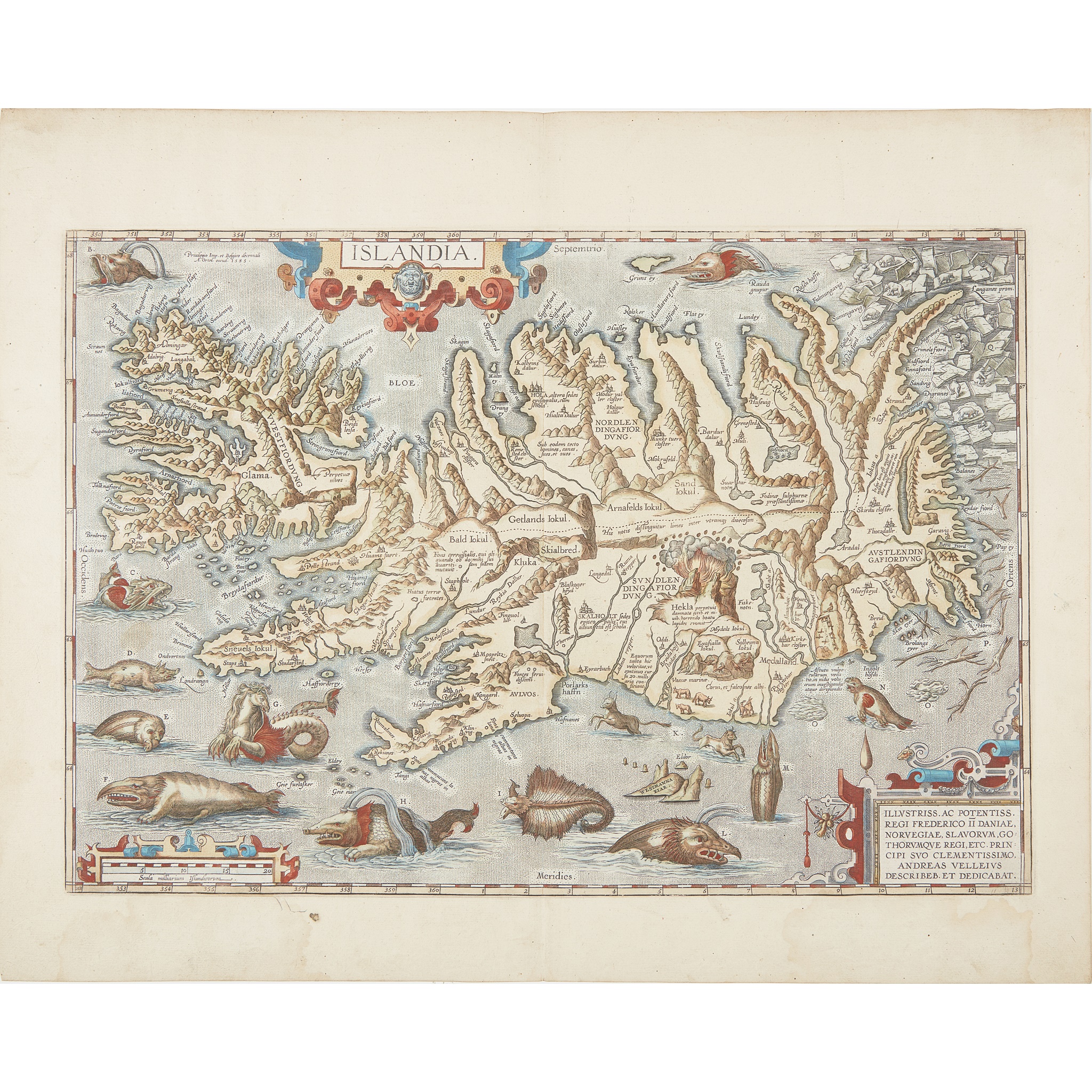[Antwerp, c.1590 or later]. Hand-coloured engraved map (platemark 33.5 x 48.5cm, sheet size 43.5 x 55.5cm), incorporating sea-monsters, polar bears and Hekla volcano, title, dedication and scale each within separate strapwork cartouche, Latin text on verso, slightly toned overall, sometime tipped to old card mount at one corner only (now detached), faint central crease as usual, another faint crease across lower left-hand corner, damp-staining to lower margins, small stain within image near left-hand edge of platemark