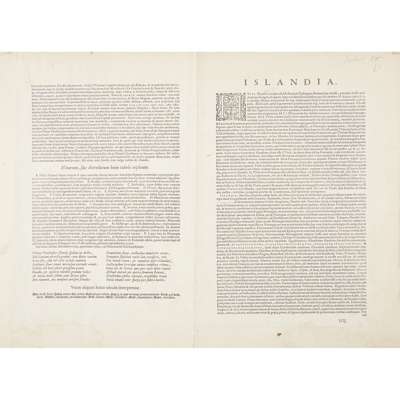 Note: Ortelius's path-breaking and richly imaginative map of Iceland first appeared in the 1587 French edition of the Typis orbis terrarum. It was drawn by Danish priest and historian Anders Sorenson Vedel or Velleius (1542-1616) using the work of Icelandic bishop Gudbrandur Thorlaksson (1547-1621), and dedicated by Ortelius to Frederick II of Denmark.