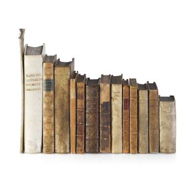 and 11 others, continental books, 17th-18th century (these not collated), including: Leo Africanus, Africae descriptio ix lib. absoluta, Leiden: Elzevir, 1632 (24mo, contemporary vellum, engraved title); Blaise Pascal, Pensées, nouvelle édition augmentée, Paris, 1684 (12mo, contemporary calf); Henry Patullo, Essai sur l'amélioration des terres, Paris, 1765 (12mo, contemporary quarter sheep); Bodoni Press, Epigrammi francesi tradotti in versi italiani, 1798 (small 4to, contemporary boards); François Richard, Targa tes pisteos tes Romaikes Ekklesias eis ten diaphendeusin tes orthodoxias [graece], Paris: Cramoisy, 1658 (2 parts in 1 volume, 4to, contemporary vellum); Ovid, Le metamorfosi, Venice: Bernardo Giunta, 1584 (without text: engraved title-page and 15 plates only, in fair condition, 4to, later wrappers); and similar (14)