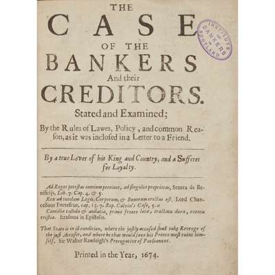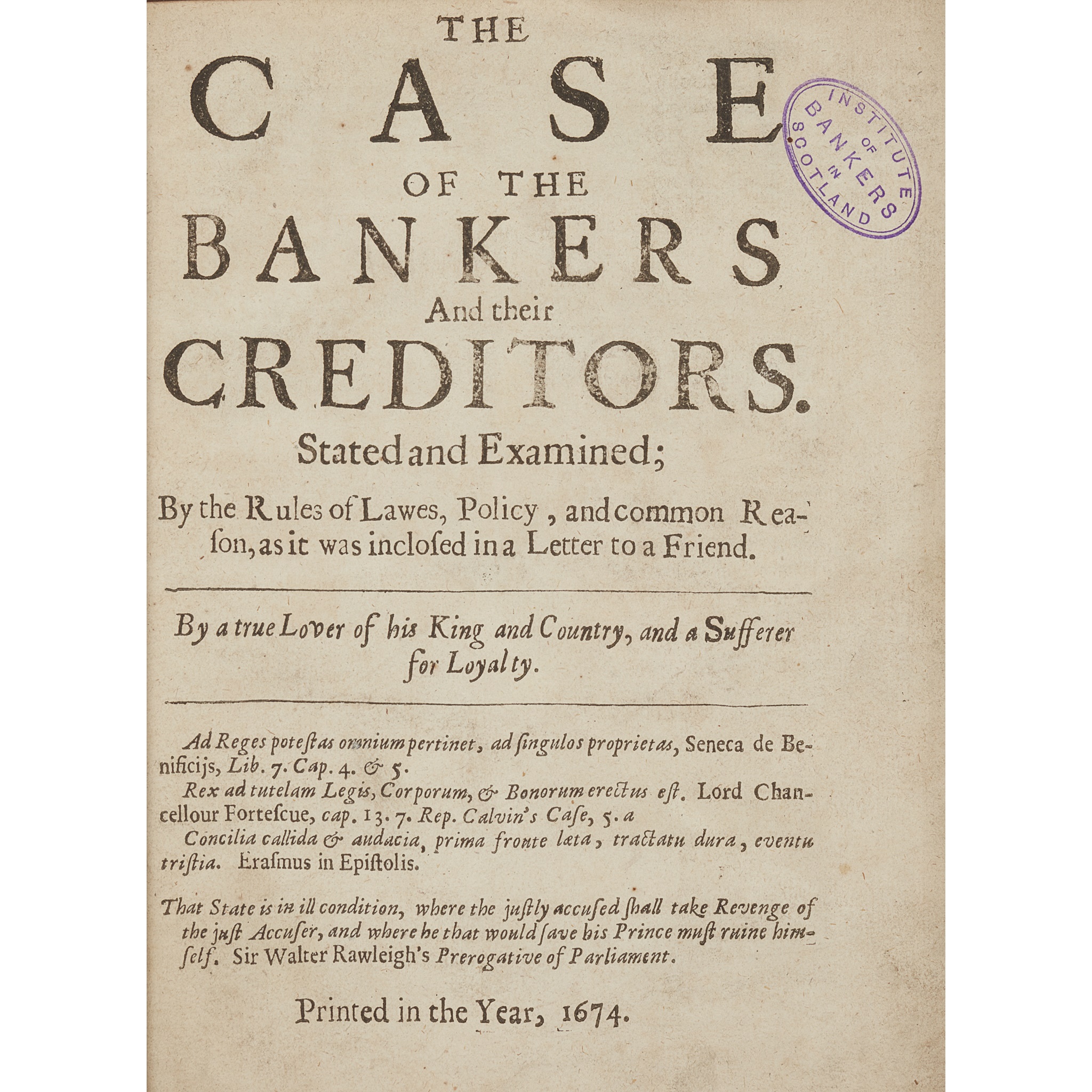 Stated and Examined; by the Rules of Lawes, Policy, and a common Reason. [London: no publisher], printed in the year 1674. First edition, 4to, 44pp., early 19th century half calf, a few letters of sidenotes slightly trimmed by binder, library stamp on title and bookplate on front endpaper of the Institute of Bankers in Scotland, rubbed, head and base of spine rubbed [ESTC R23756, 25 copies British Isles, 15 copies N. America], A4 with the trimmed outer edge neatly reattached by the binder