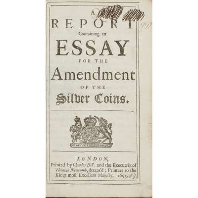 [Lowndes, William]. A Report Containing an Essay for the Amendment of the Silver Coins. London: Charles Bill, and executrix of Thomas Newcomb, 1695. 8vo, contemporary inscription to blank leaf before title 'sent me at ye Custome house, Nov. 1695', initials W.Y. in manuscript at foot of title, early ownership inscription at head of title deleted, contemporary calf, stamp to front endpaper and bookplate of the Institute of Banker in Scotland, rubbed, upper cover detached [ESTC R509573 - 4 copies U.K., 1 copy N. America, 2 copies Japan];