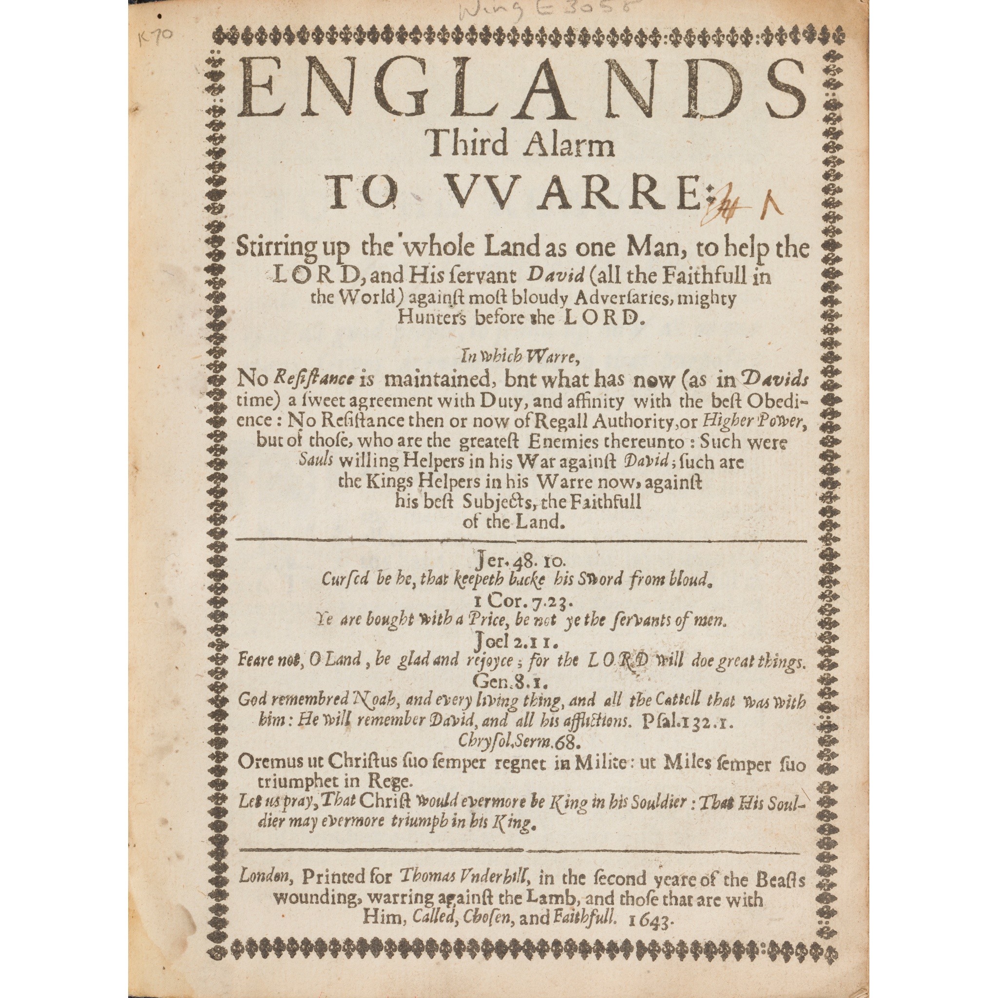 Englands Third Alarm to Warre: stirring up the Whole Land as One Man, to help the Lord, and His Servant David (all the Faithfull in the World) against most Bloudy Adversaries, Mighty Hunters before the Lord. London: Thomas Underhill, 1643. First edition, 4to (17.9 x 13.2cm), modern cloth, light browning, marginal damp-stains [ESTC R9479, 11 copies world-wide; Wing E3058];