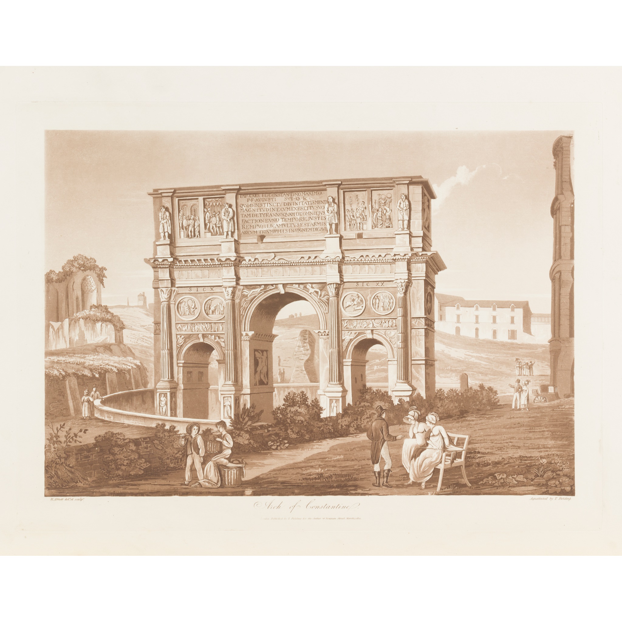 London: Baldwin, Cradock, and Joy, 1820. First edition, large folio (57.6 x 41.6cm), contemporary half calf (front board gilt-lettered 'Charleton' and with gilt calf title-label 'Rome' to centre), letterpress title-page, etched panorama of Rome on 4 folding sheets, 24 sepia aquatint plates, descriptive text-leaf to each plate, tissue-guards, backstrip perished, panorama with faint spotting and offsetting in places and first sheet with faint crease across one corner, plates faintly offset onto text-leaves through tissue-guards [Abbey Travel 179]