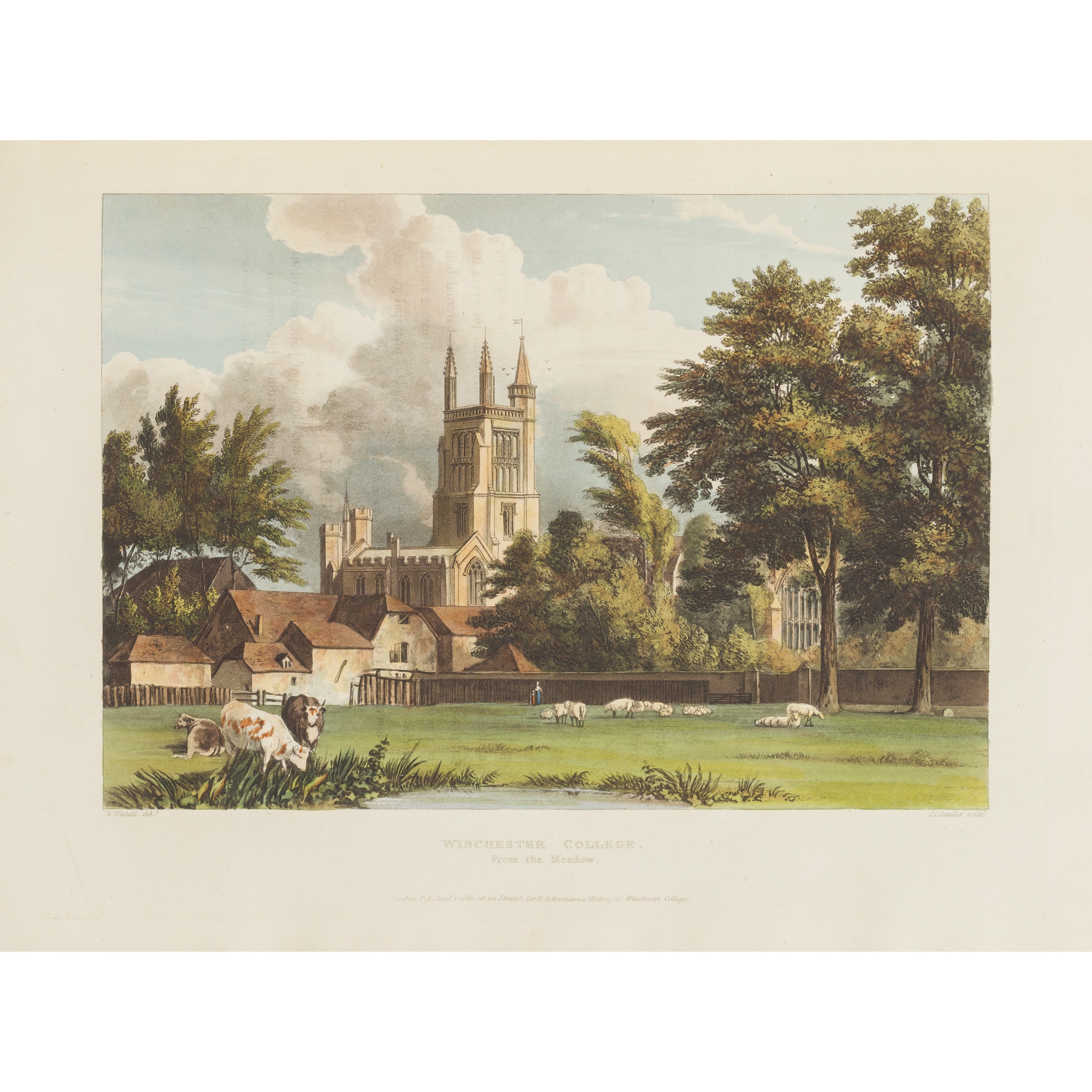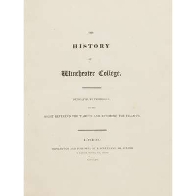 Note: Seemingly an independently issued copy of "The History of Winchester College", issued as part of Ackermann's "Public Schools" - "The History of the Colleges of Winchester, Eton and Westminster..." [Abbey, Scenery, 438], with 56 text leaves and the 1st January 1815 issue of the "Winchester College from the Meadow" plate. The main title-page reads "The History of Winchester College", a copy of the same cannot be traced in the British Library or in Abbey Scenery.