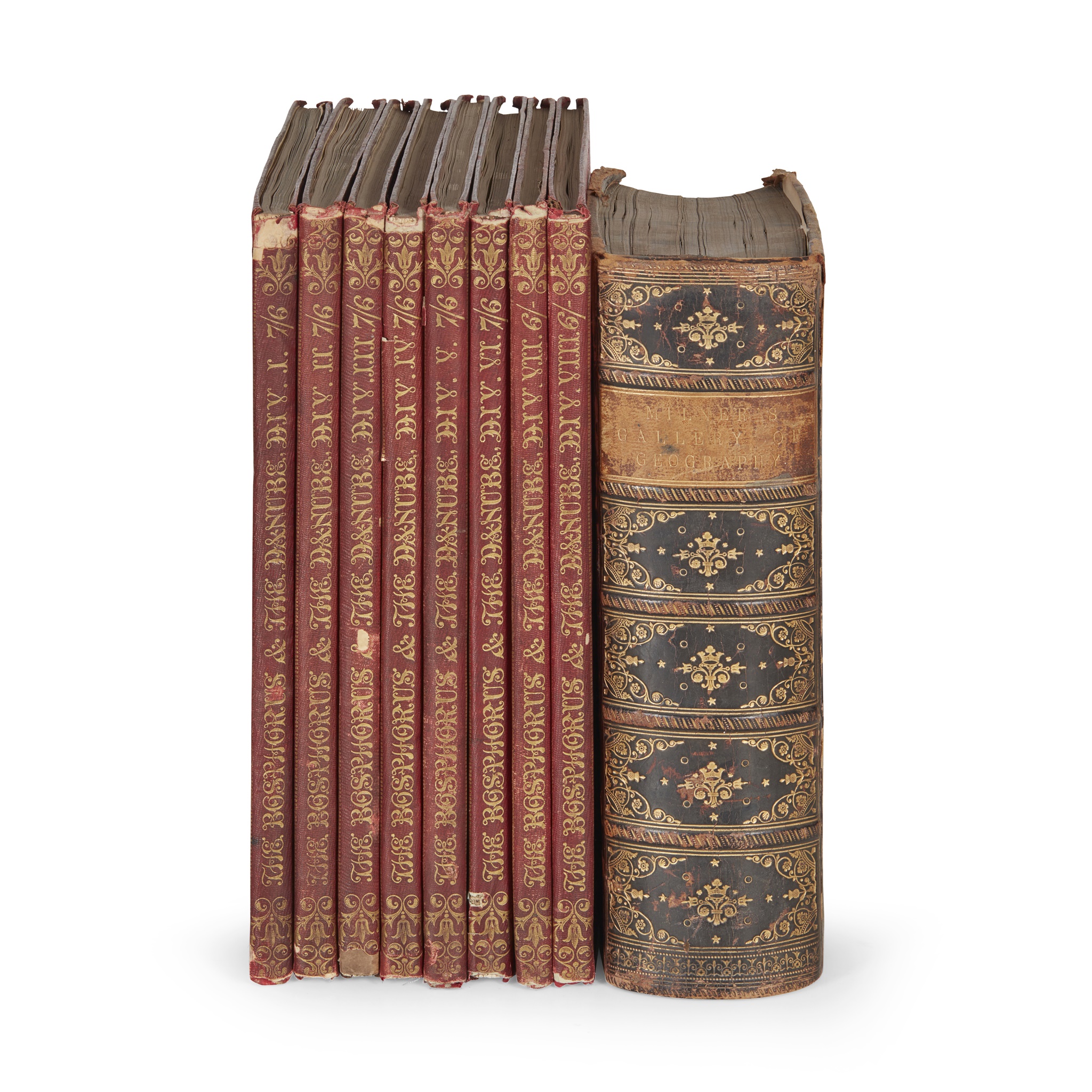 Pardoe, Julia. The Beauties of the Bosphorus. London, [1838], 8 original parts, 4to, 2 engraved title-pages, 3 portraits, 3 maps and 164 engraved plates, original pictorial red cloth gilt, faint waterstain to 5 of the 8 volumes, mostly marginal and mostly light, head and base of spines worn;