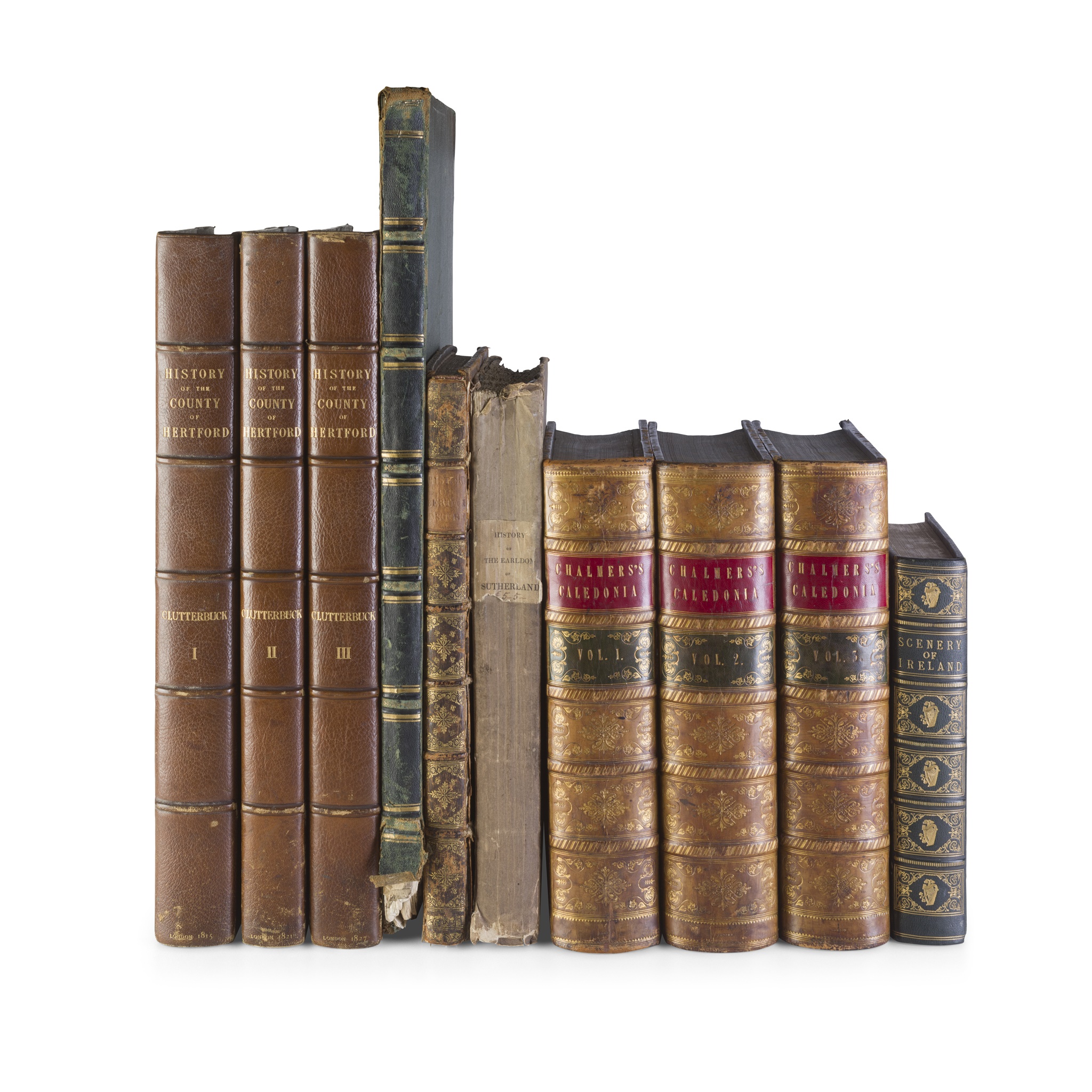 Chalmers, George. Caledonia: or, an Account, Historical and Topographic, of North Britain, from the most Ancient to the Present Times. London: for T. Cadell, 1810-10-24. Second, first and first editions, all on large paper, 3 volumes, 4to (33.5 x 24.5cm), later tree calf gilt with twin morocco labels, engraved folding map, 5 plans, folding table, bookplates (motto 'Fortes fortuna juvat'), volume 1 head of front joint cracked;