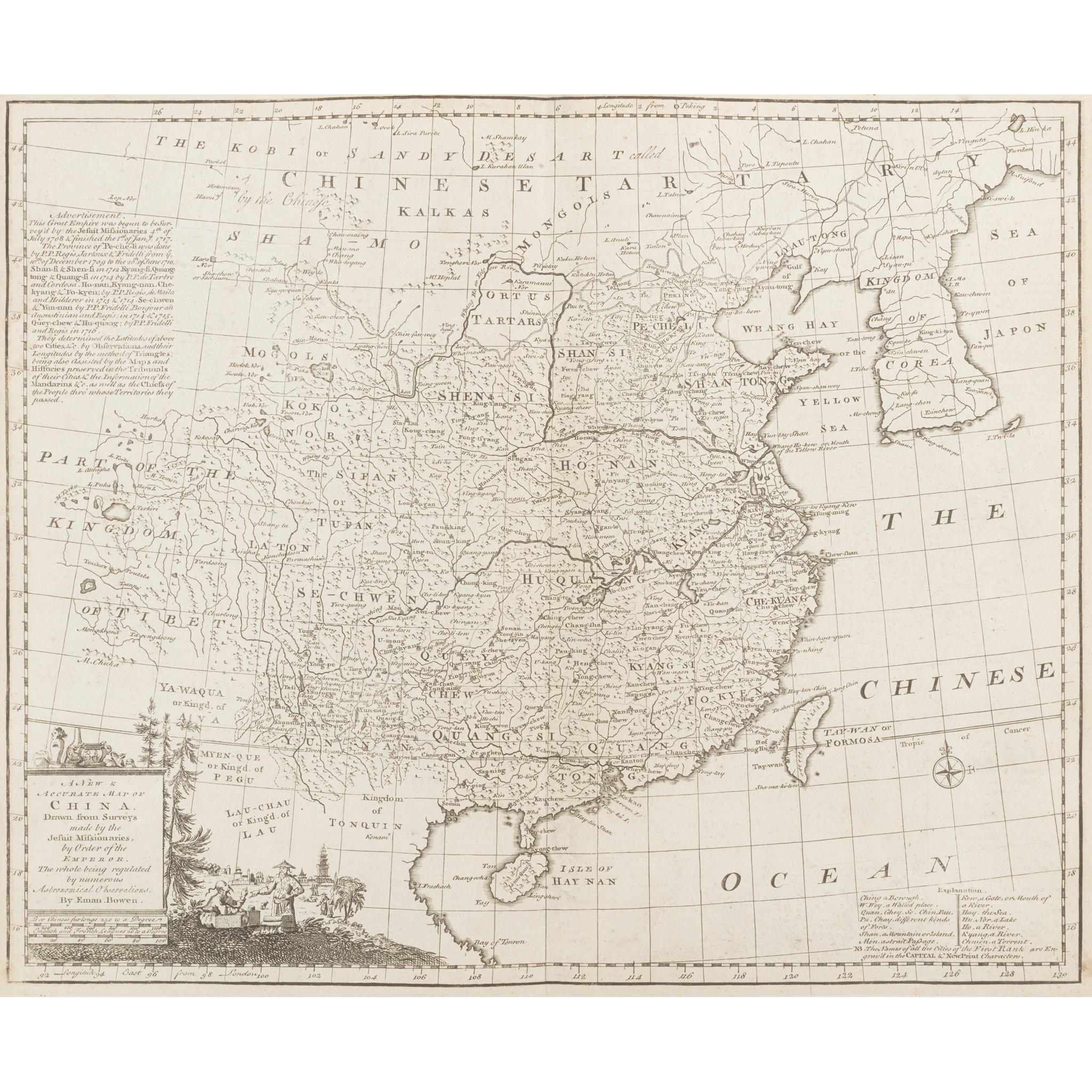including: A New and Accurate Map of China; A New and Accurate Map of the Empire of Japan; Turky in Asia, Arabia, etc.; A New and Accurate Map of Persia; A New and Accurate Map of Anatolia or Asia Minor, with Syria and Other Provinces of the Turkish Empire; A New and Accurate Chart of the World; all approx. 36.5 x 43cm, each with central fold, trimmed close to or past neatline in places, World map browned, light browning to others. Together with 3 engraved plates ('A Genealogical Table of the Tribes of the Genuine Arabs'; 'A Genealogical Table of ye Tribes of the Naturalized Arabs'; 'The Tribe of Koreish'), and 48 further engraved maps, 18th century, European, historical or biblical, by Bowen, Blundell, Basire and others (57 in 1 folder)