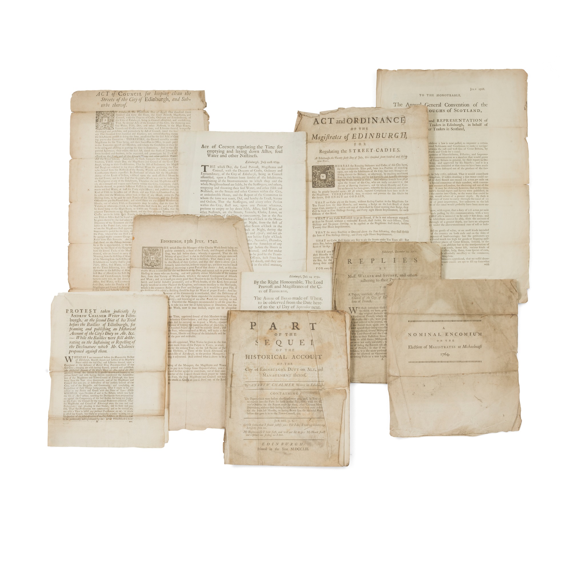 Act and Ordinance of the Magistrates of Edinburgh, for Regulating the Street Cadies. Edinburgh, twenty sixth day of July 1739, folio, 1 page [not on ESTC]; By the Right Honourable, the Lord Provost and Magistrates of the City of Edinburgh. The Assize of Bread made of Wheat, to be observed... Edinburgh, July 24th 1730, 2 copies printed recto only on a folded sheet [not found on ESTC];