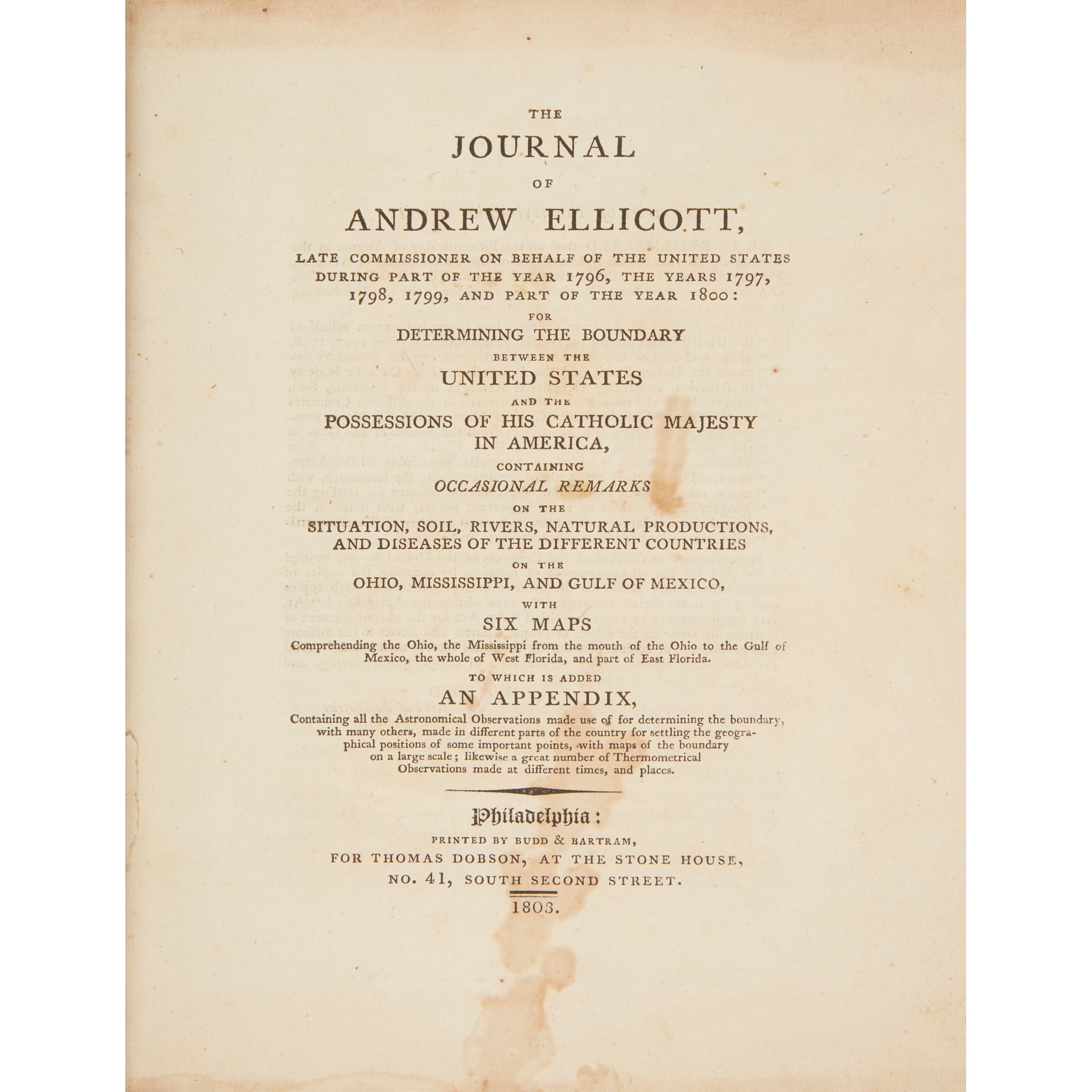 Late Commissioner on behalf of the United States during part of the year 1796, the year 1797, 1798, 1799, and part of the year 1800: for determining the boundary between the United States and the Possessions of His Catholic Majesty in America... Philadelphia: Thomas Dobson, 1803. First edition, 8vo, contemporary calf, bookplates of William Emory Quinby and Canadarqua Library, rubbed, with some marking to lower board, with 5 (of 8) folding charts and diagrams in Appendix only and lacking the 6 folding engraved maps, a couple of closed tears to plates, marginal dampstaining and some spotting