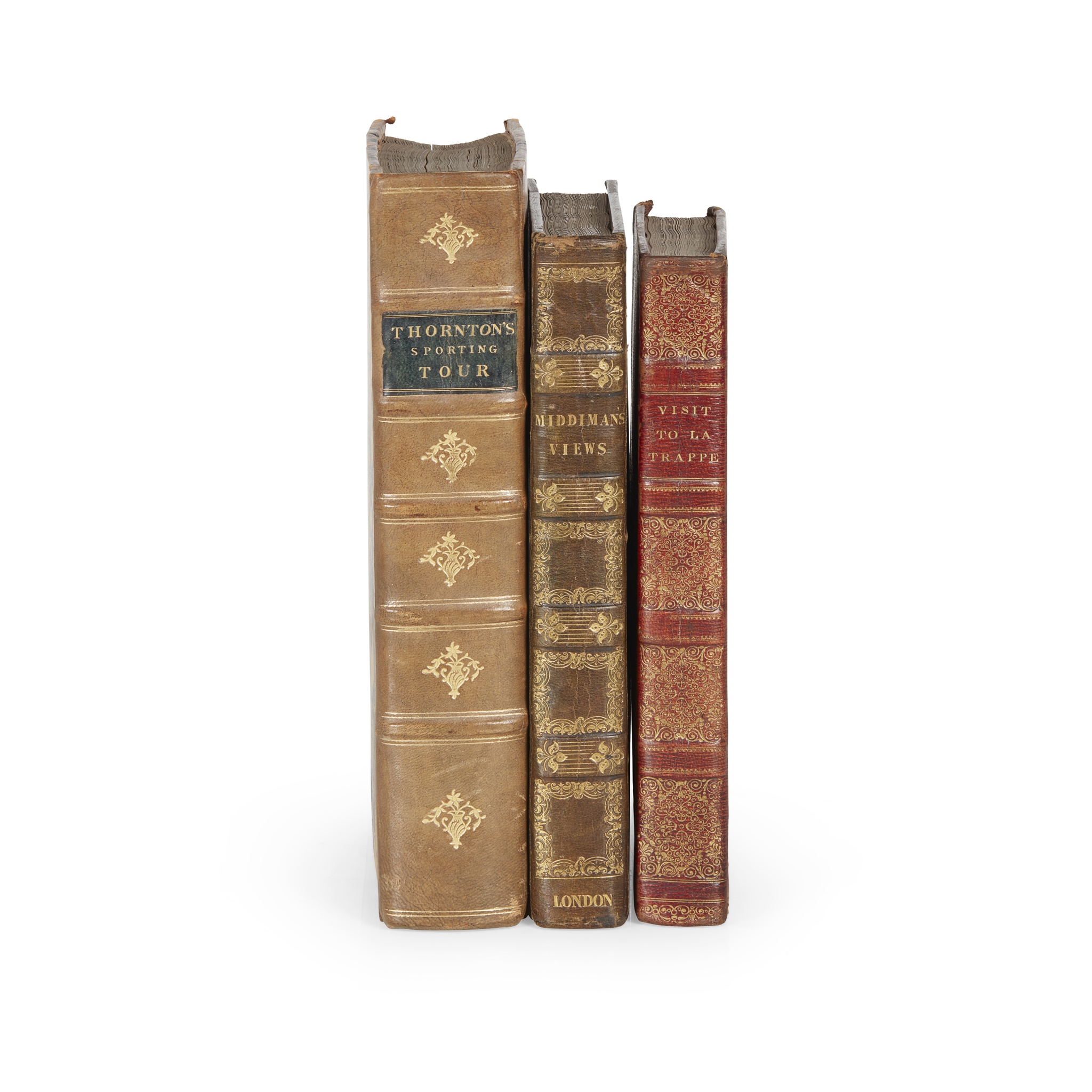Thornton, Colonel. A Sporting Tour through various parts of France in the year 1802. London: Longman &c., 1806. 2 volumes in one, large 4to, 2 engraved titles, frontispiece, 52 uncoloured aquatint and engraved plates, (11 folding), and 2 leaves of music, later half calf with marbled boards, spine gilt, retaining original black morocco lettering piece (3)