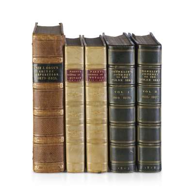 Idem. Narrative of a Second Expedition to the Shores of the Polar Sea, in the Years 1825, 1826, and 1827. London: John Murray, 1828. 4to (27.5 x 21.2cm), 20th-century blue half morocco gilt uniform with the preceding work, 31 engraved plates, 6 engraved folding maps, light browning to plates, maps mounted on linen stubs, browning to 'Discoveries made by British Officers' map, variable light offsetting to others, repaired tears to text-leaves P4 and (in Appendix) d3, manuscript date to title-page in blue ink [Abbey Travel 635; Sabin 26228];