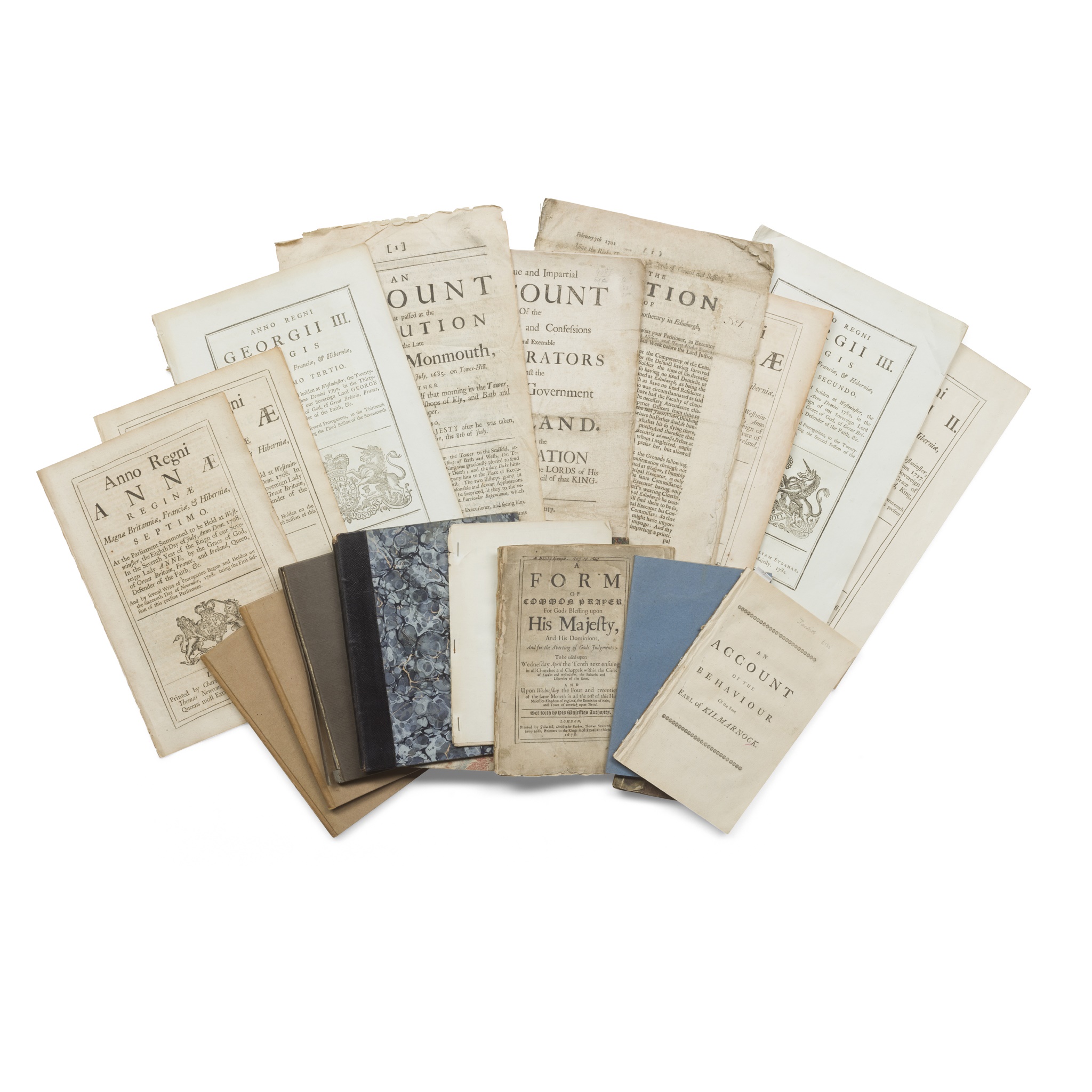 and 12 others similar (these not collated), including 5 Acts of Parliament, 18th century (e.g. To prevent the infamous Practice of Stock-jobbing, 1734; For Settling and Establishing a Court of Exchequre in the North Part of Great Britain called Scotland, 1708; For rebuilding the Tron Church of the City of Glasgow [...], 1793, etc.; all disbound) (21)