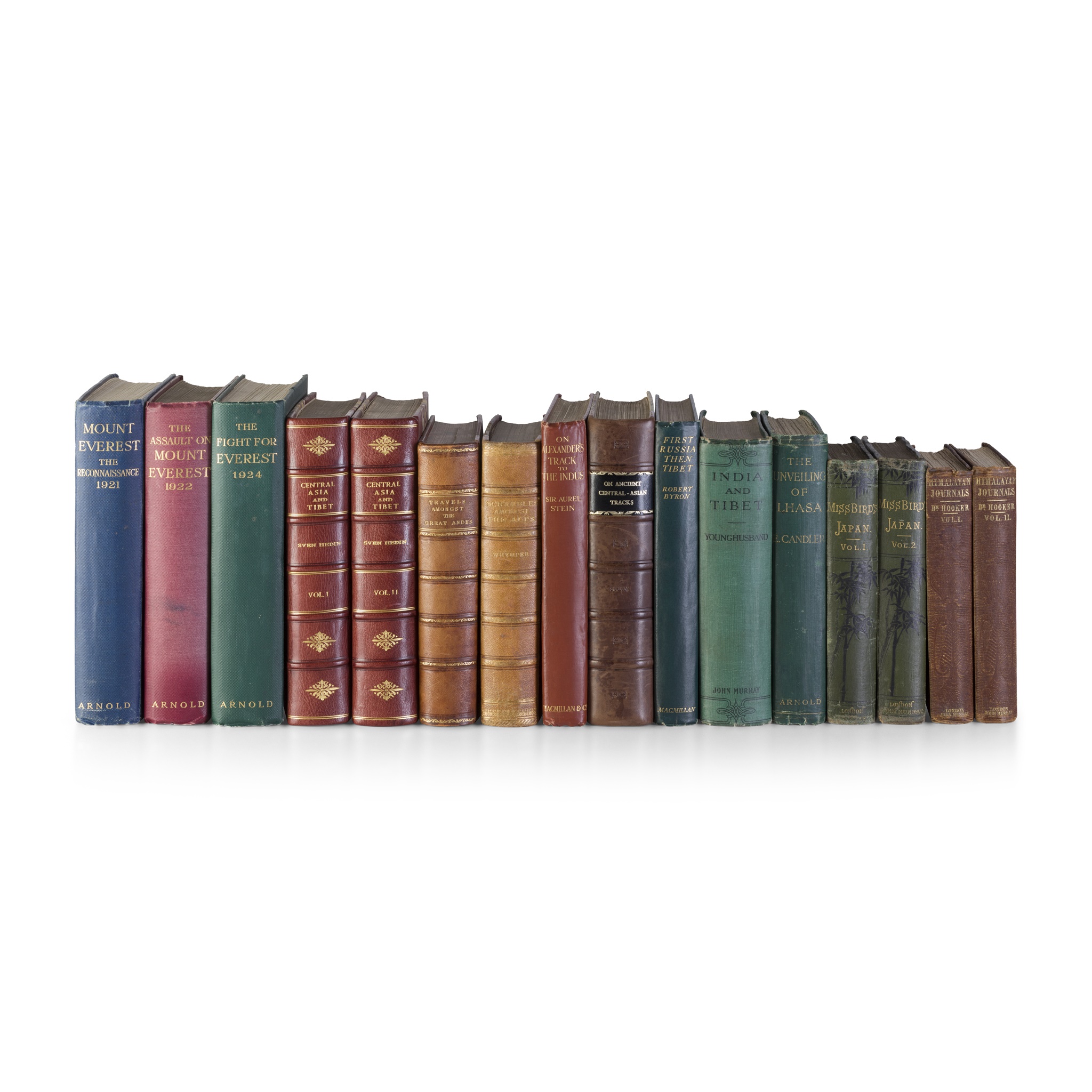 and 8 others (these not fully collated): Joseph Dalton Hooker, Himalayan Journals, 1855 ('new edition, carefully revised and condensed', 2 volumes, 8vo, original red pictorial cloth gilt, slightly rubbed, wood-engraved frontispieces, colour plate, volume 2 inner hinges strengthened); Edward Whymper, Scrambles amongst the Alps in the Years 1860-69, 1871 (second edition, 8vo, contemporary half morocco); idem, Travels amongst the Great Andes of the Equator, 1892 (second edition, 8vo, contemporary half morocco); Edmund Candler, The Unveiling of Lhasa, 1905 (fourth impression, 8vo original cloth, inscribed 'Claude Auchinleck, from M. E. A., October 1906', spine strengthened); Sven Hedin, Central Asia and Tibet, 1903 (first edition, Australasian issue, 2 volumes, 8vo, recent red crushed half morocco); Isabella L. Bird, Unbeaten Tracks in Japan, 1880 (first edition, 2 volumes, 8vo, original pictorial cloth gilt, recased and relined, rubbed); Robert Byron, First Russian then Tibet, 1933 (first edition, 8vo, original cloth); Francis Younghusband, India and Tibet, 1910 (2nd impression, 8vo, original cloth) (16)