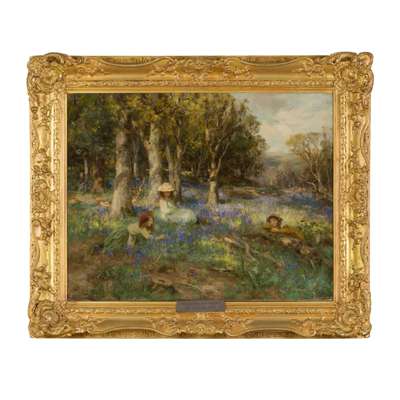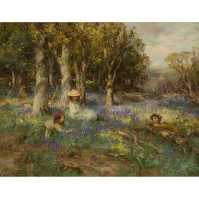 It is believed that MacGeorge's predilection to gloomy colours - possibly the Hague School influence - was challenged by Edward Hornel, who encouraged MacGeorge to soften his tone, thus making his paintings brighter, his brushstrokes more richly imparted, and his painting style considerably more decorative. However, MacGeorge always maintained a substantial level of individuality in his artistic approach, particularly in his pursuit of truth to natural forms. His most prominent works transmit naturalistic atmosphere enhanced by vigorous brushwork and bright spots of colour. Although MacGeorge's choice of subjects was extremely diverse, his signature setting is a woodland scene with children playing among the flowers. The present work, The Blue Haze of the Hyacinth, belongs to a large series of works depicting utopian idylls. Here the artist portrays three young ladies resting in a meadow filled with azure bursts of wild hyacinth. An example of MacGeorge's colouristic approach, the work presents a vivid impression of a bright summer day, as well as the artist's signature impasto brushwork.