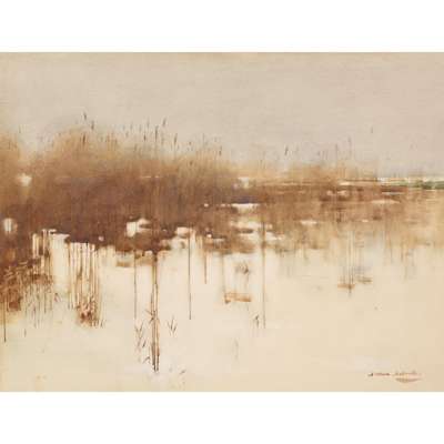 Note: Duddingston Loch was a constant source of inspiration for Melville, and as Kenneth McConkey points out in his 2015 National Galleries of Scotland exhibition catalogue, Melville's obituary in the Haddington Advertiser recorded that as a student at the R.S.A. Schools 'the reeds at Duddingston were a favourite sketching ground of his, and to gratify this taste he had to get up at five o'clock in the morning, so much work did he do during the day.'