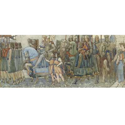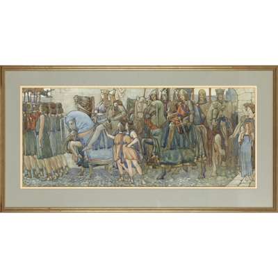 Robertson attended salons hosted by the symbolist painter John Duncan, where he mingled with artists and academics. Duncan had a profound influence on Robertson’s painting, as did Celtic lore, medievalism and the work of the Pre-Raphaelite Brotherhood. This is evident in the whimsical figures forming a procession in Queen Guinevere Entering the Court of King Arthur. The animated composition and rich detail may also be indebted to Robertson’s visits to Italy, where he encountered early Renaissance murals and altarpieces, and recalled being enamoured with the work of Fra Angelico and Botticelli.