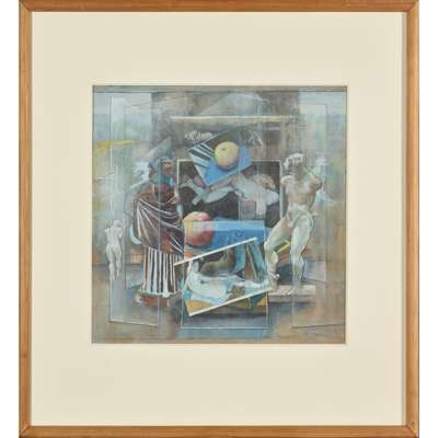 This work is very closely related to Cowie’s Composition of 1947 (oil on wood, 46.3 x 45.5cm) which was presented to the National Galleries of Scotland (NGS) by the artist Sir William Oliphant Hutchison in 1970 (accession number GMA 1167). Both works date from Cowie’s time as Warden of Hospitalfield House, Arbroath between 1937 and 1947. He is renowned for his painstaking working method and could spend up to a week assembling still-life objects before beginning to draw or paint them. As is the case with the present work, he often made multiple detailed studies, in materials including pastel, gouache and chalk. He considered some of them to be complete, independent works of art and would frame and exhibit them in their own right.