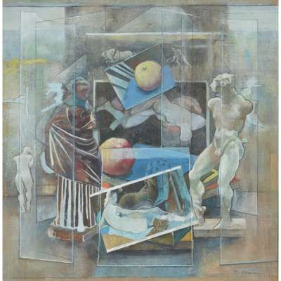 The artist and critic Cordelia Oliver has described the NGS Composition thus: ‘The culmination of the metaphysical still-lifes is a painting called, simply, Composition….In it illusion and reality, as with the apple that appears and reappears amid the interlocking planes of glass and the layers, in depth, of concrete objects and printed images, are so blurred and intermingled that to unravel one from the other is impossible. The rear view of the statuette on the left (it may be a small medieval Madonna)…is here balanced by a new, vaguely disturbing Pan-presence, a figure modelled by Cowie himself in some self-hardening plastic material…Cowie’s figure is modelled with a soft, but muscular and highly charged plasticity, which is echoed in the dissolving voluptuous forms of Cranach’s Diana and Ingres’s Grande Odalisque. Several layers farther into the complex space a print of a peasant ploughman (after Millet) and beyond that a hint of those narrow filaments of sandy road together speak for the perennial link with…the countryside… a love of which James Cowie never disguised.’ (Cordelia Oliver, Modern Scottish Painters: James Cowie, Edinburgh University Press, 1980, p. 54).