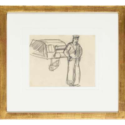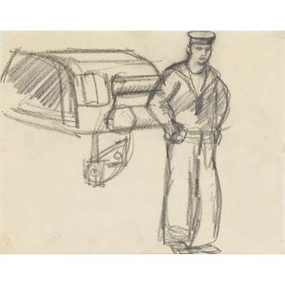 In 1918 Fergusson spent six months working in Portsmouth after receiving permission from the Admiralty to 'gather impressions for painting a picture' (letter from Commodore Sir Douglas Brownrigg to J. D Fergusson of 9 July 1918, Imperial War Museum Archive, file ref. 216/6, no. 27). This work is one of the resultant sketches and drawings which informed a series of paintings he made on return to his studio in London (see Alice Strang, 'Go to Portsmouth to gather impressions for painting a picture': The World War One Work for the Admiralty of J. D. Fergusson (1874-1961)', The British Art Journal, Vol XVI, No.3, Winter 2015/16, pp. 98-102).