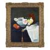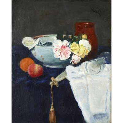 The Blue Tablecloth (Still Life with Tasselled Fan) is a fine examples of Hunter’s work from the first phase of his career as an artist of distinction and recognition. European travels provided access to a catholic range of art in public and private galleries, in addition to what he saw in America. His biographer T. J. Honeyman cites ‘very indifferent reproductions’ in an early scrapbook, from which ‘one can surmise the line of his approach and make a fair guess that his heroes, Chardin and Manet competed with the Dutch in his early essays in still-life painting.’ (T. J. Honeyman, Introducing Leslie Hunter, Faber and Faber, London, 1937, pp.56-57).