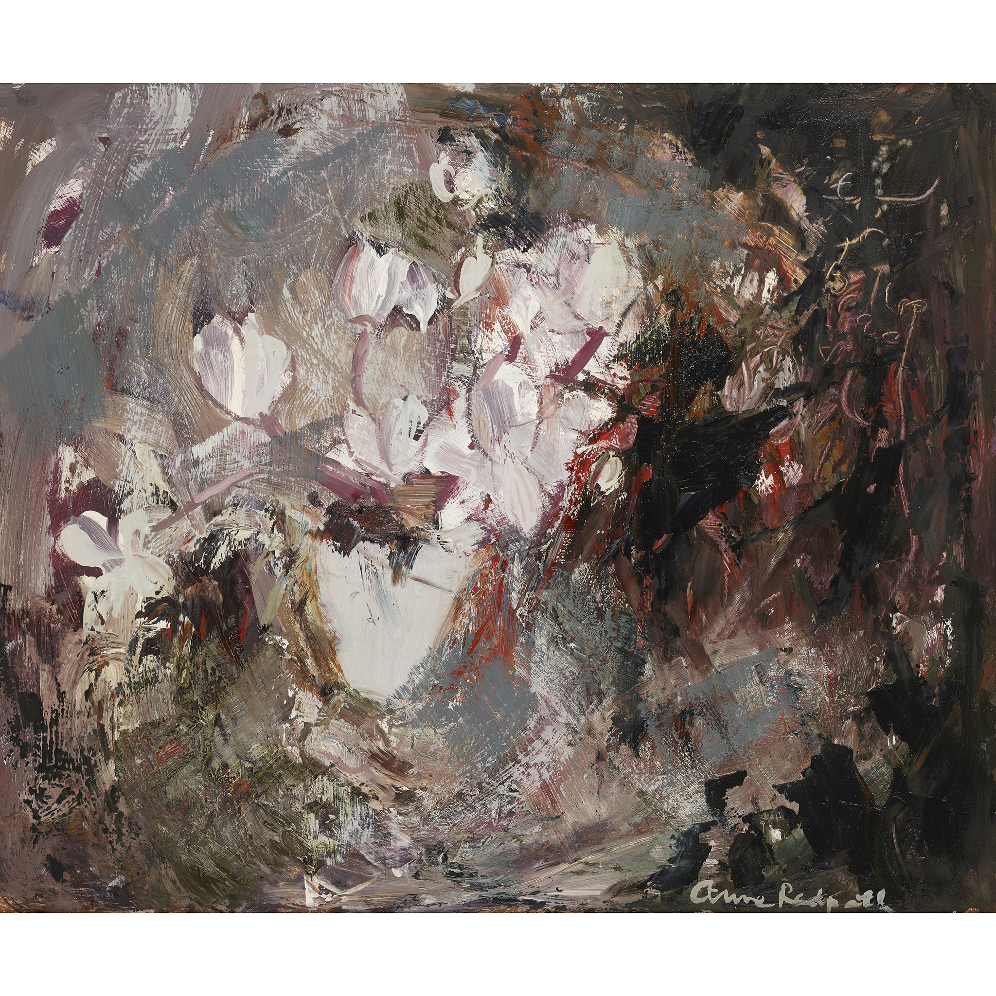 In 1961, the Scottish poet George Bruce visited Redpath at her home in Edinburgh in order to interview her for the BBC. He recalled: ‘When filming began, one of her milking stools, which she had just painted as a gift to one of her grandchildren, stood, by chance or intention, beside a cyclamen in a pot – the one a simple artefact made to last, brightly coloured with a flowing design painted by herself, the other a pale delicate flowering cyclamen, the white flowers changing to deepening tones at their centres. Both and all were Anne Redpath.’ (George Bruce, Modern Scottish Painters: Anne Redpath, Edinburgh University Press, 1974, p. 61.).
