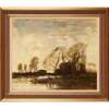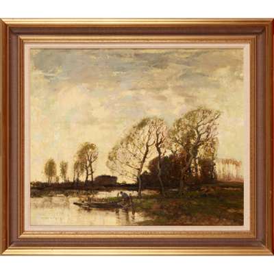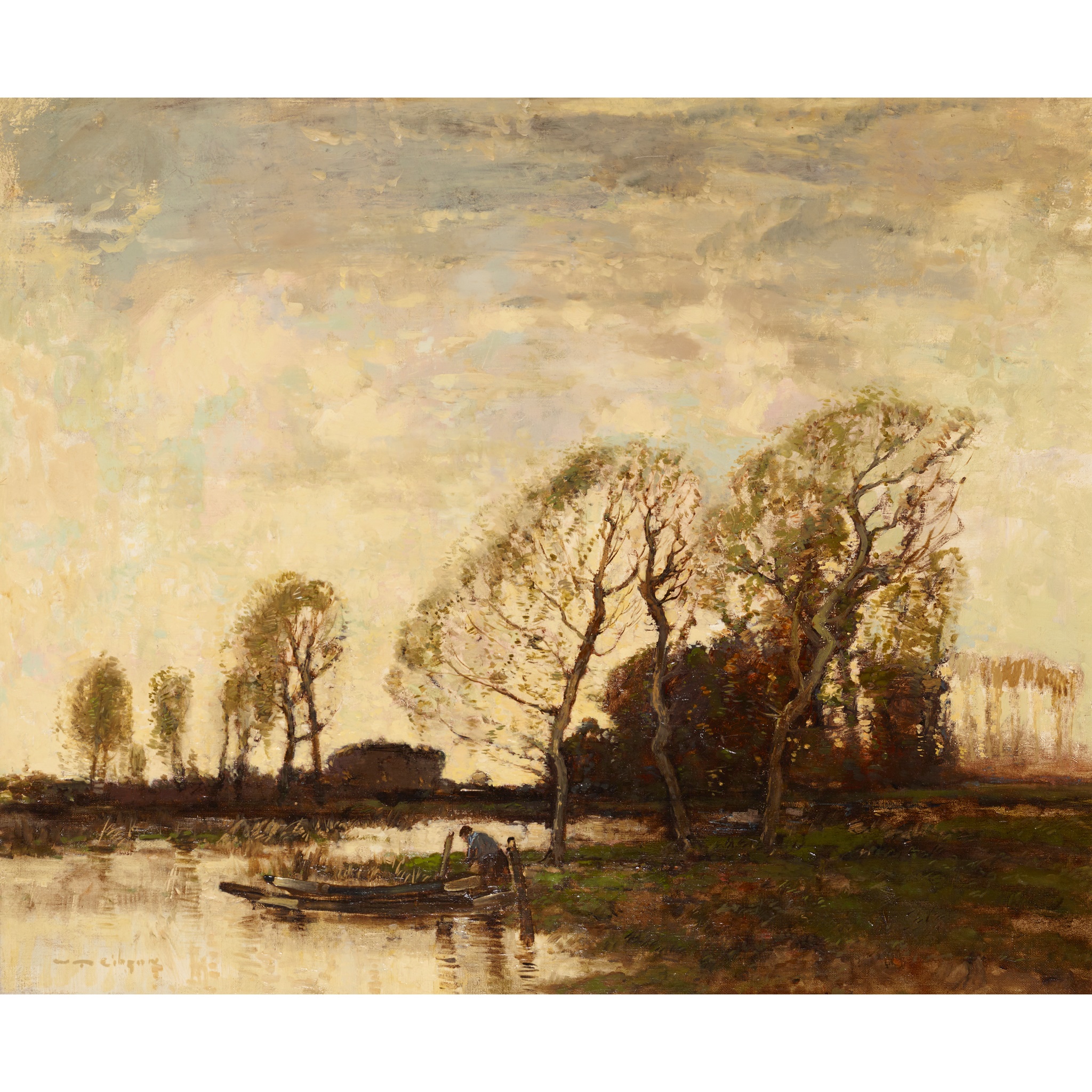 A WOODED RIVER LANDSCAPE WITH FIGURE IN A PUNT