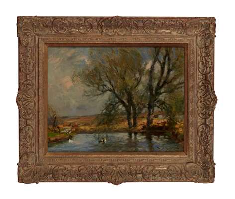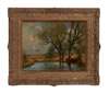 A WOODED RIVER LANDSCAPE WITH DUCKS