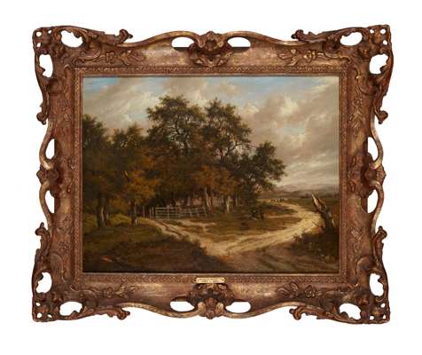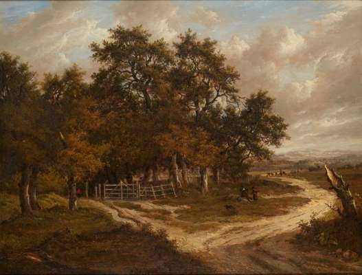 TRAVELLERS ON A WOODED COUNTRY LANE