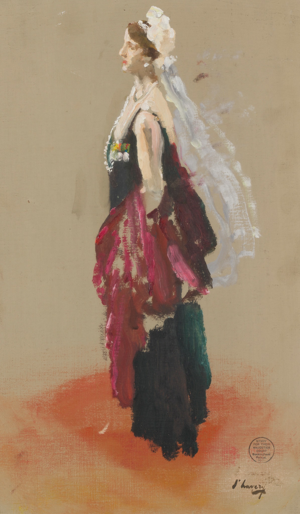 Exhibited: P. & D. Colnaghi & Co., London, Their Majesties’ Court, Buckingham Palace, 1931, Portrait Studies and Other Sketches by Sir John Lavery RA, November 1932
