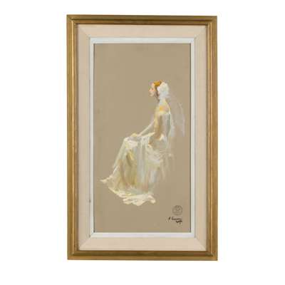 Mrs Leo d’Erlanger (née Edwina Prue, 1907-1994) was a New Yorker, and junior editor of Vanity Fair when she married Baron Leo Frédéric Alfred d'Erlanger, son of the painter and musicologist, Baron Rodolphe François d’Erlanger. In the twenties he joined the family bank run by his uncle, Emile. Both Rodolphe and Emile were friends of the Laverys, the painter having supported their protest against internment as enemy aliens during the Great War. Lavery painted a second sketch of Mrs d’Erlanger at the Court (Sold Bonhams 14 November 2012) and her portrait was also painted by Laszlo in 1937.