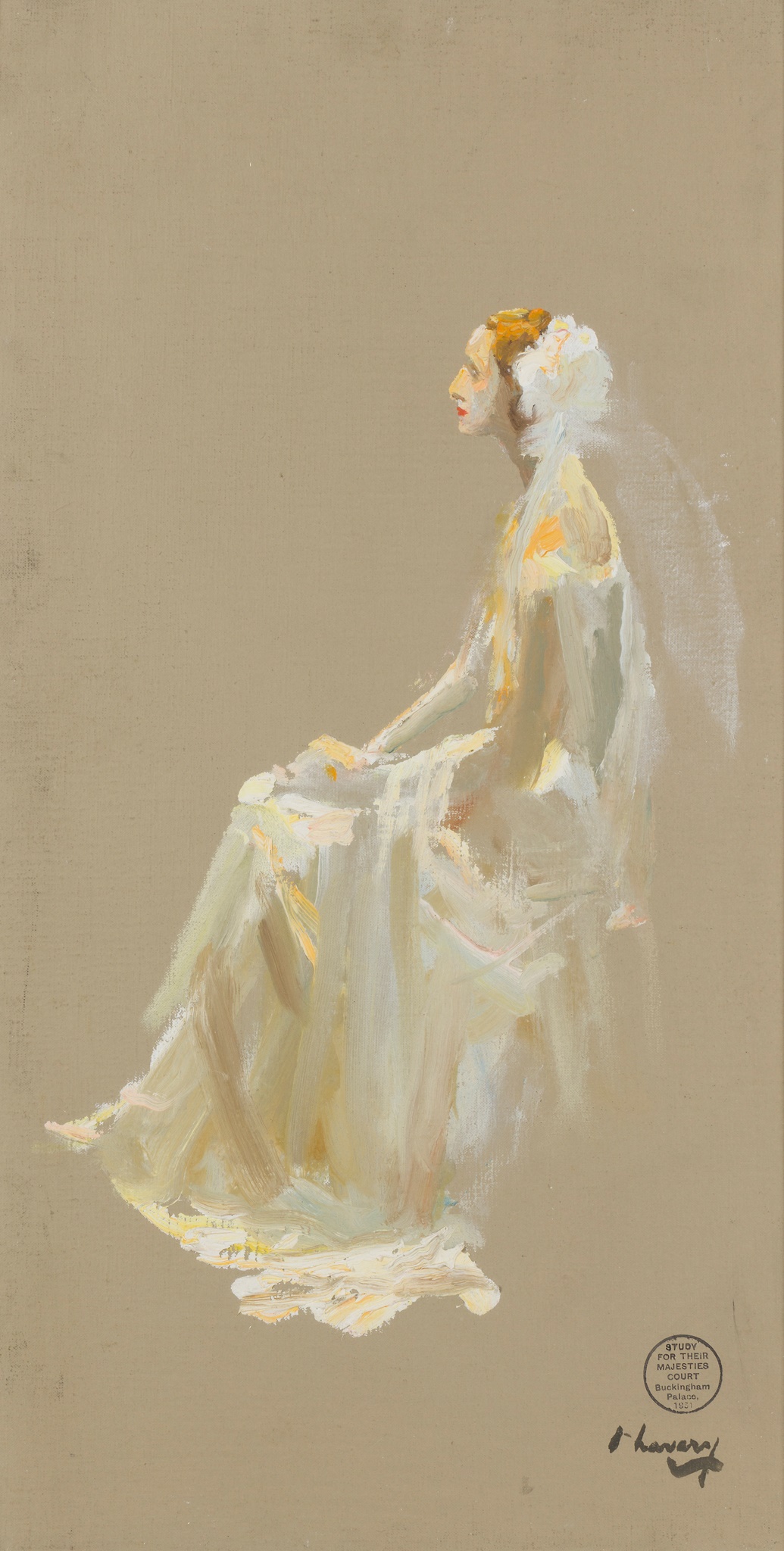 Exhibited: P. & D. Colnaghi & Co., London, Their Majesties’ Court, Buckingham Palace, 1931, Portrait Studies and Other Sketches by Sir John Lavery RA, November 1932