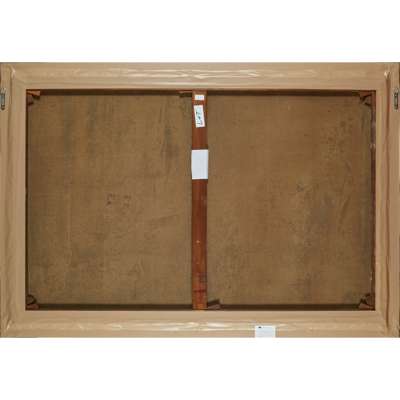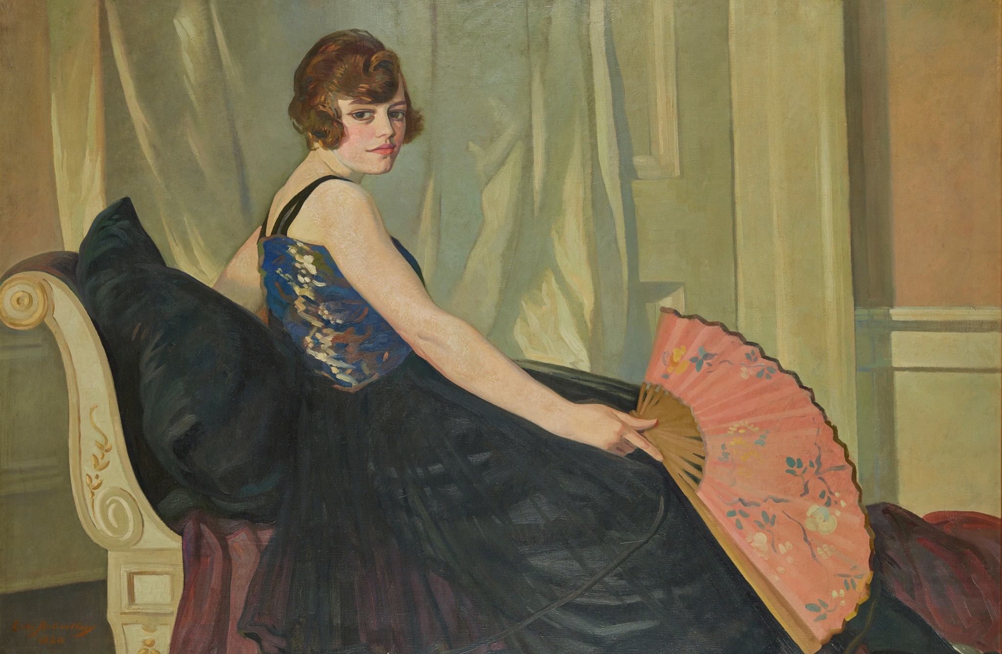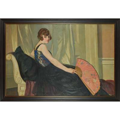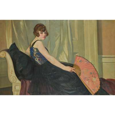 It was during this propitious period that Robertson painted the impressive The Rose Fan of 1920. As noted in the artist’s records, held in a private archive, the sitter is Miss Maisie Luman and this was Robertson’s fifty-first oil painting. It is a celebration of the beauty and sophistication of young womanhood. The elegant Miss Luman reclines on a chaise longue and turns her head to meet the viewer’s gaze. Restrained sensuality abounds, as her bare skin is striking in comparison with the opulent evening gown she wears, whose skirt layers are masterfully rendered. Indeed, Robertson’s skills as a draughtsman are plain to see, particularly in the passages of fabric not only in his model’s outfit, but also in the realisation of the cushion which provides support, the material on which she sits and that which is hung behind her. Details including the positioning of her fingers on the titular fan and the pattern on this accessory itself, add to the feeling of luxury which pervades the painting.