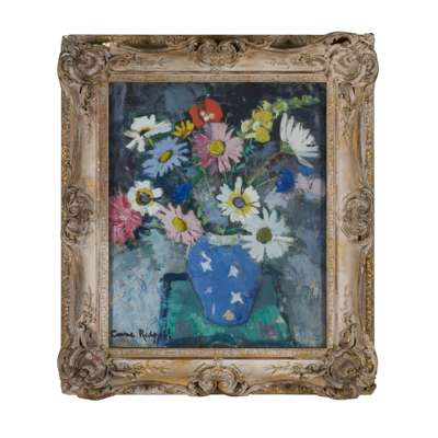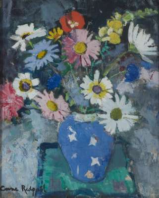 The striking patterned vessel in Marguerites provided one such prop. The bright blue which covers most of its surface is the perfect complement to the variously coloured titular flowers which spill out of and over its neck. The arrangement is set upon a square of fabric, itself placed on an enigmatic surface, with hints of the surrounding space provided in the background. Redpath’s relish in the application of paint is clear from the precise detailing of petals, to the broader brushstrokes with which expressive swathes of the support are covered.