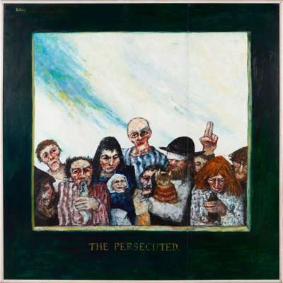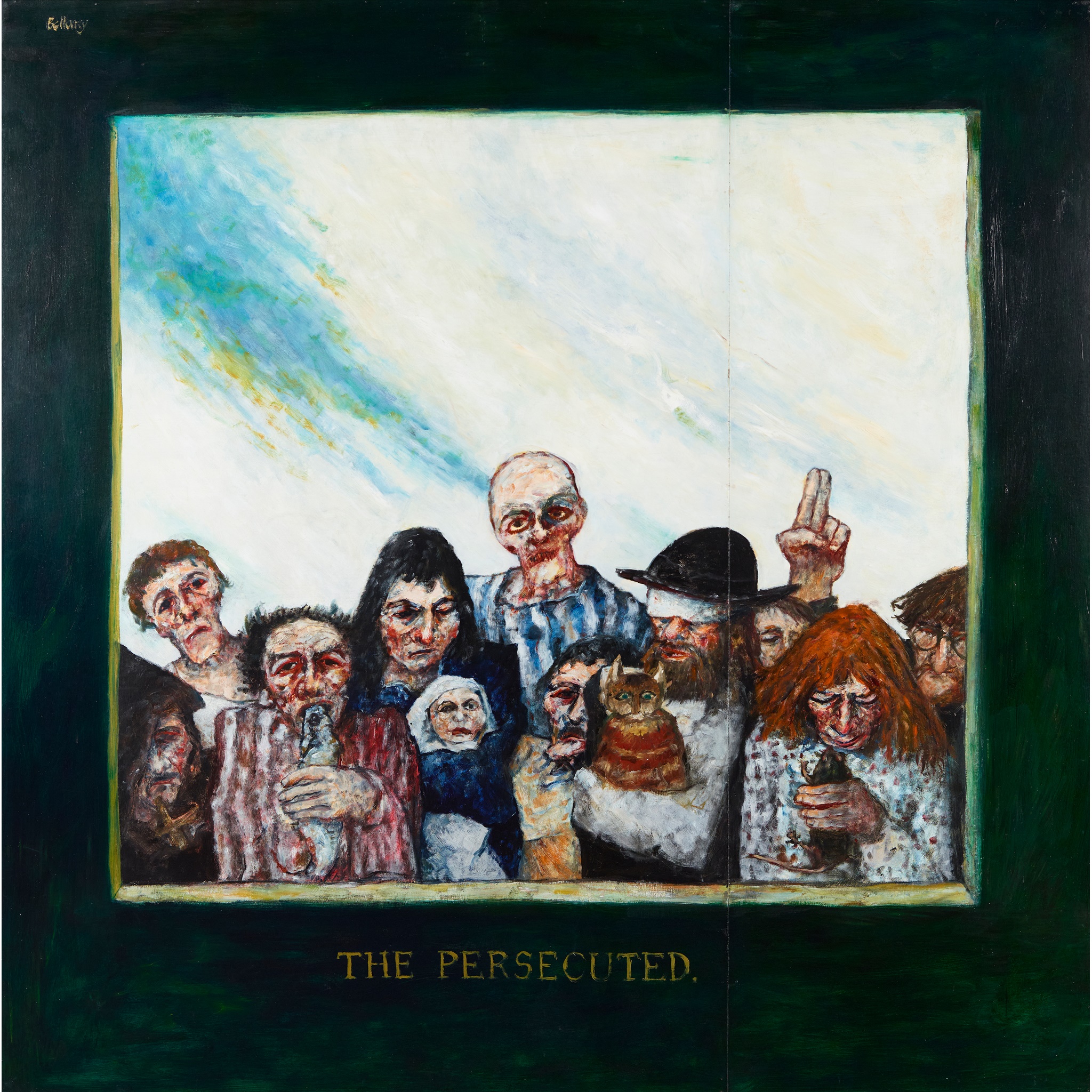 In ‘The Persecuted,’ Bellany centres the people that were sent to camps such as Buchenwald: the sick; the disabled; the homeless; political prisoners; those convicted of crimes, to name but a few. Bellany does not baulk at their suffering, choosing instead to portray his subjects as emaciated and huddled together. We can sense the cold, their discomfort, their hunger but there is also a vitality and vibrancy here, a defiance. The approach is confronting, with the intimidating scale and imposing dark green frame crowding the figures while also compelling our gaze towards them, as they stare directly back at us. Thus, Bellany forbids the viewer to shy away from their grim reality and committed endurance in the face of adversity.