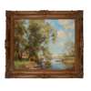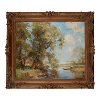 A WOODED RIVER LANDSCAPE WITH FIGURE IN PUNT